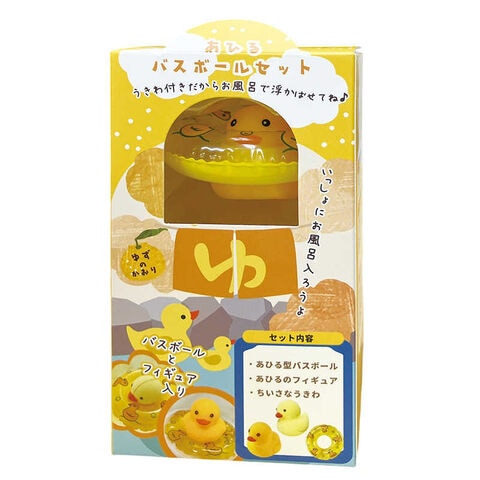 アヒルのバスボールをうきわにセットして湯船に浮かべるとバスボールの泡で前に進みます。