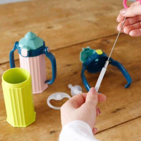 ストローマグをご使用後、ブラシに洗浄剤をつけストローの内部をすみずみまで洗浄してください。煮沸消毒ができます。(薬液消毒、電子レンジ消毒はお避けください。)
