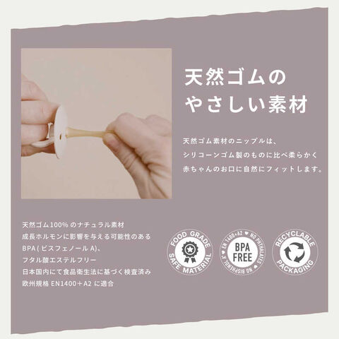 柔らかな天然ゴムのニップルには空気を逃がす弁があり、赤ちゃんが吸うことで空気が抜け、口内の形状に自然にフィットします。