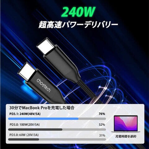 CHOETECH PD3.1 240W USB-C to USB-C Cable 1m [USB Power Delivery対応] ブラック XCC-1035