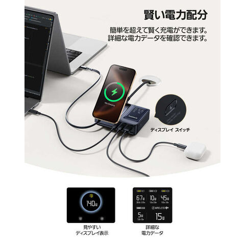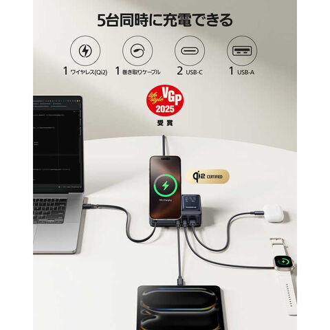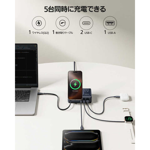Qi2ワイヤレス充電器と有線PD急速充電器が一体化最大140W出力対応の5-in-1デスクトップ充電ステーション100W急速充電対応の巻き取り式ケーブルを内蔵スマートディスプレイで充電状況をひと目で確認60°まで自由に調整可能なQi2充電スタンド質感と機能美を兼ね備えた、フラット&省スペース設計