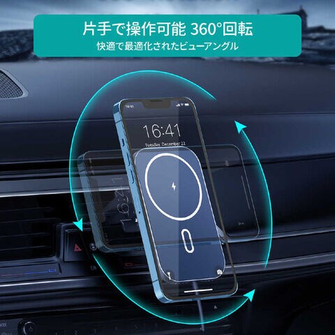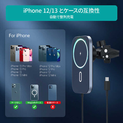 MagSafeカーマウントは、MagSafeケースにも対応しており、iPhone 14/13/12シリーズをケースごとセットするだけで使用できます。