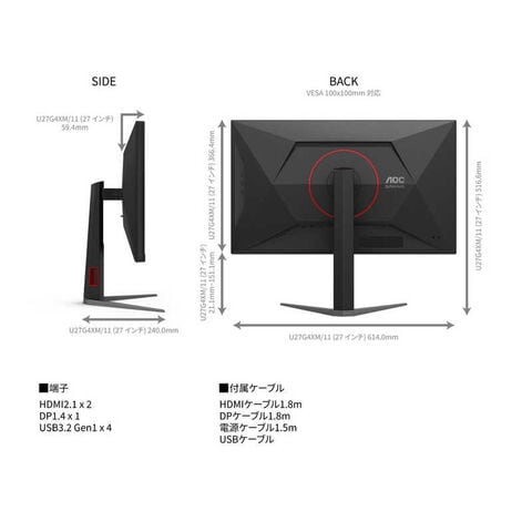 付属品:電源ケーブル1.5m、HDMIケーブル1.8m、Displayportケーブル1.8m、USBアップストリームケーブル1.5m、スタンド、ベース、保証書、ケーブル付属リスト