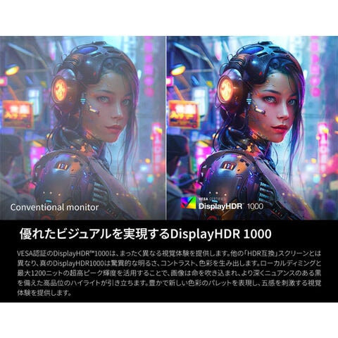 VESA認証のDisplayHDR 1000により、最大1200ニットの輝度とローカルディミングで深みのある黒と鮮明なハイライトを実現。