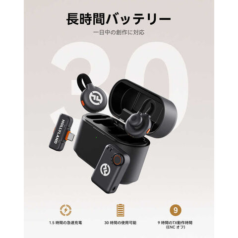送信機単体の使用時間は最大9時間ですが、完全に充電された専用ケースを使用すれば合計30時間まで延長可能です。