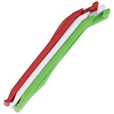 チューブのかみ込みが少ない形状の使いやすいタイヤレバーです。強度の高い高品質樹脂を使用。3本がクリックオンで合体し、携帯に便利。3本1組。