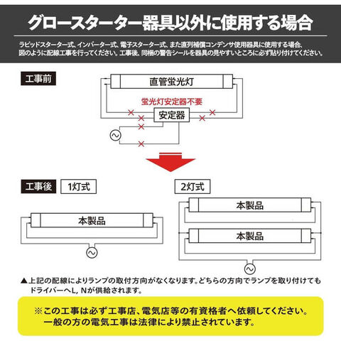 グロースターター式照明器具にそのまま使えるLED直管LEDで省エネ、長寿命安心の5年保証注意事項:グロースターター式(FL)以外の方式(ラピッド式(FLR)、インバーター式(HF))の器具に取り付ける場合は、AC電源の直結工事をする必要があります。
