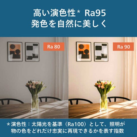 太陽の下での光(Ra100)と非常に近い演色性を持つ照明のため、色がより正しく鮮やかに表現されます。