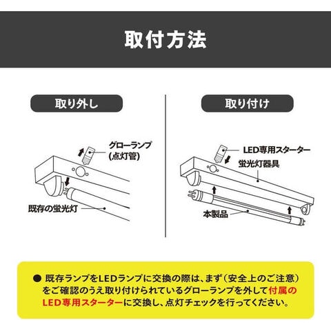グロースターター式照明器具にそのまま使えるLED直管LEDで省エネ、長寿命安心の5年保証注意事項:グロースターター式(FL)以外の方式(ラピッド式(FLR)、インバーター式(HF))の器具に取り付ける場合は、AC電源の直結工事をする必要があります。