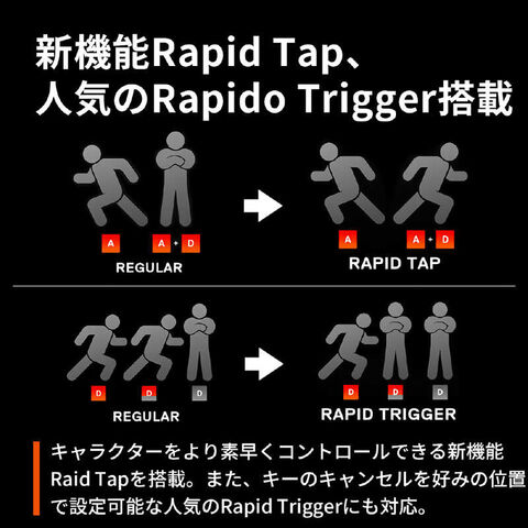 新機能Rapid Tap、人気のRapido Trigger搭載 キャラクターをより素早くコントロールできる新機能Raid Tapを搭載。