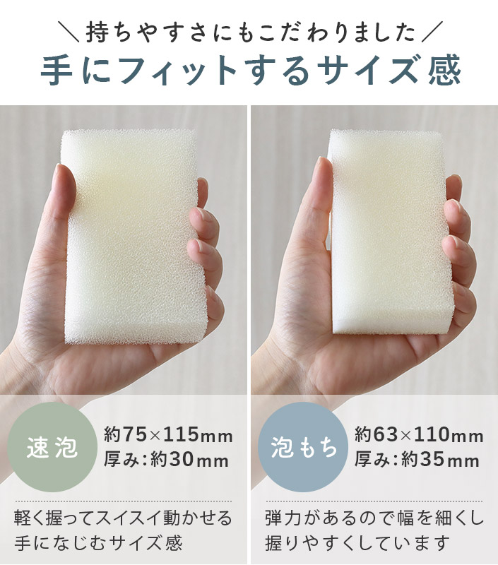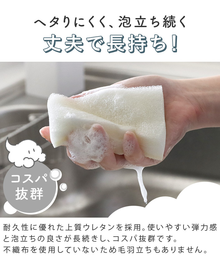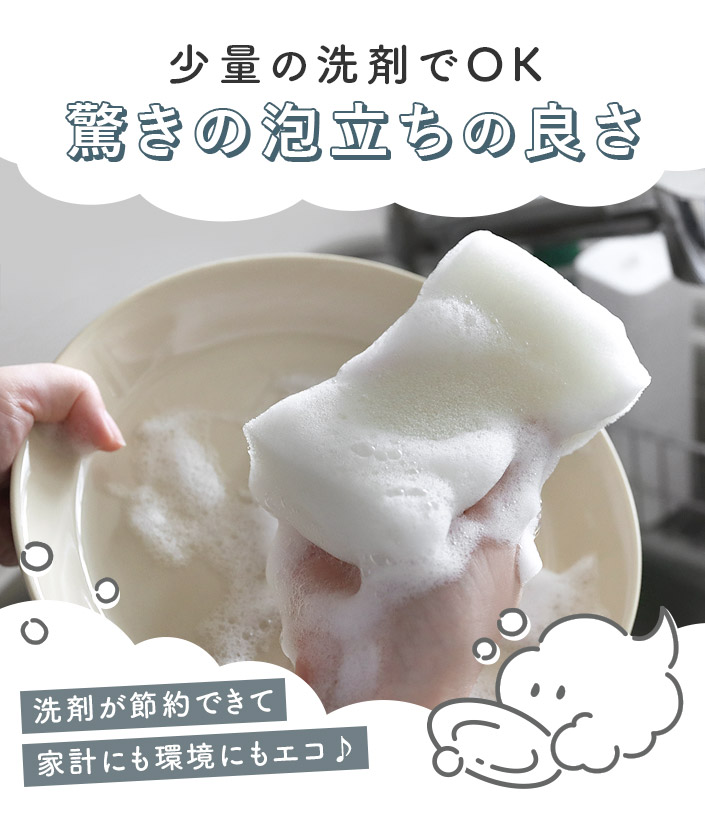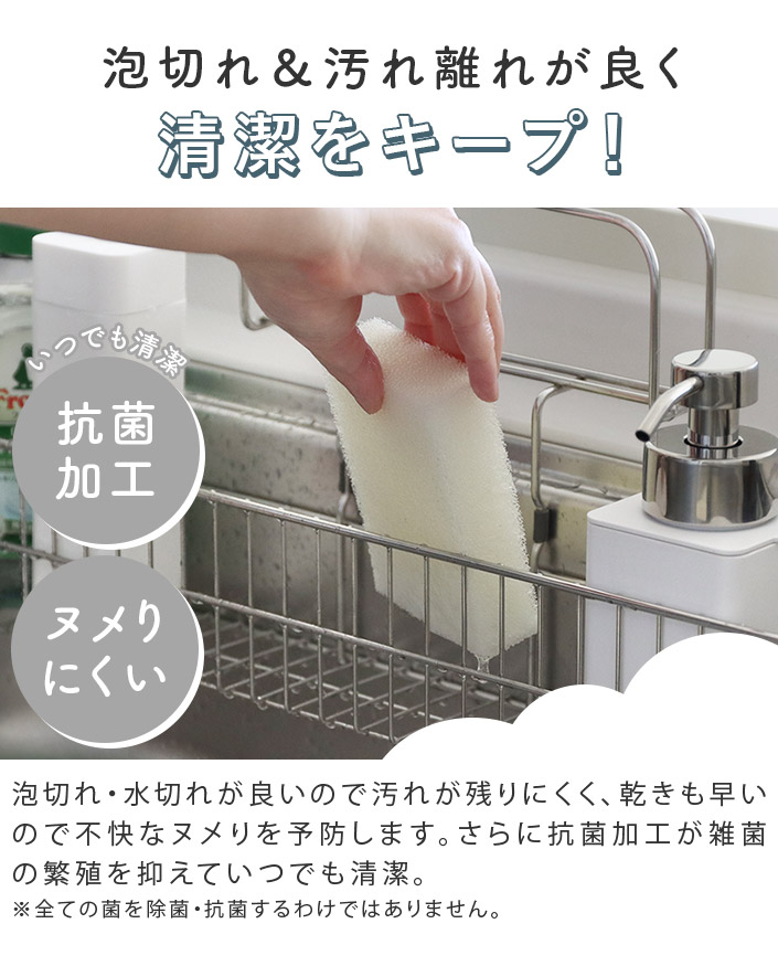 ●スポンジ部分には抗菌加工を施しています。※抗菌加工はスポンジの表面に付着した雑菌の増殖を抑制するもので、スポンジに付着したゴミや汚れに発生した菌には効果がありません。
