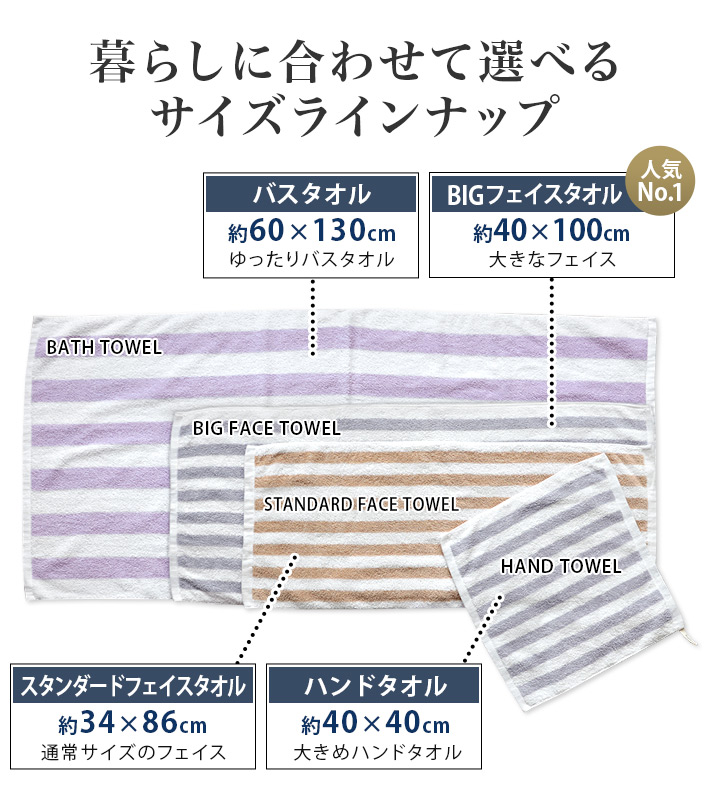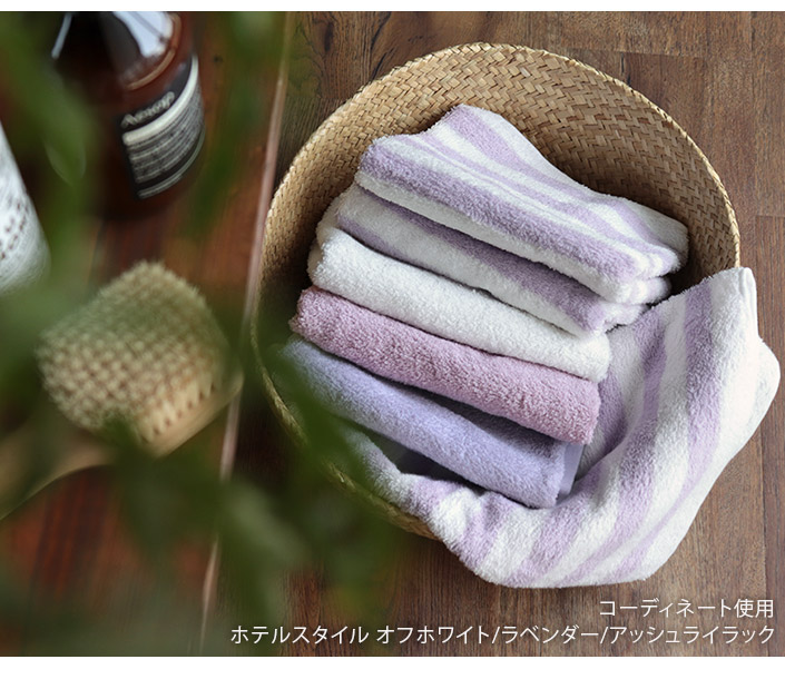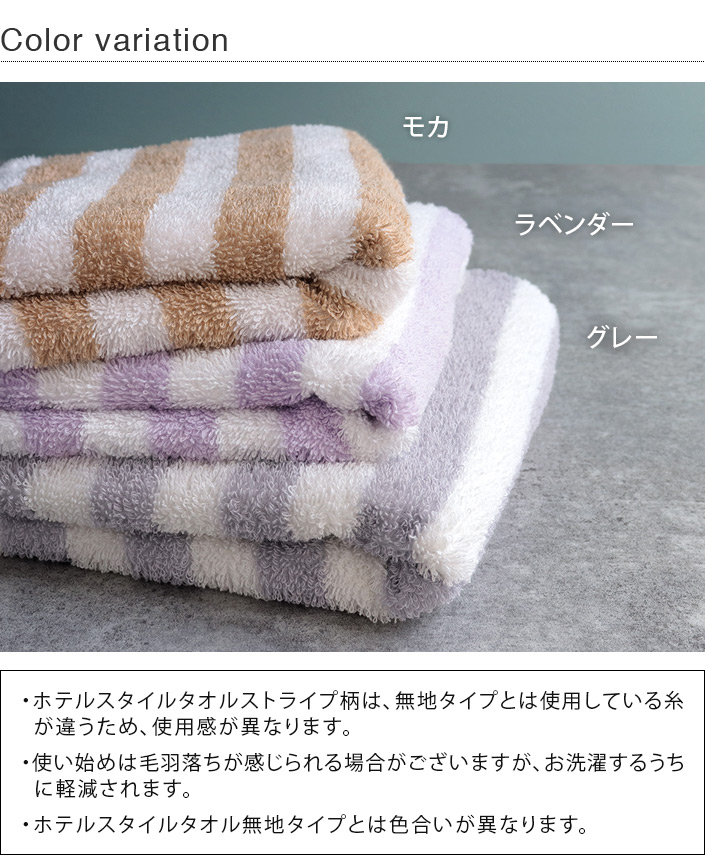 ※ホテルスタイルタオル ストライプ柄は、無地タイプとは使用している糸が違うため使用感が異なります。使い始めは毛羽落ちが感じられる場合がございますが、お洗濯するうちに軽減されます。