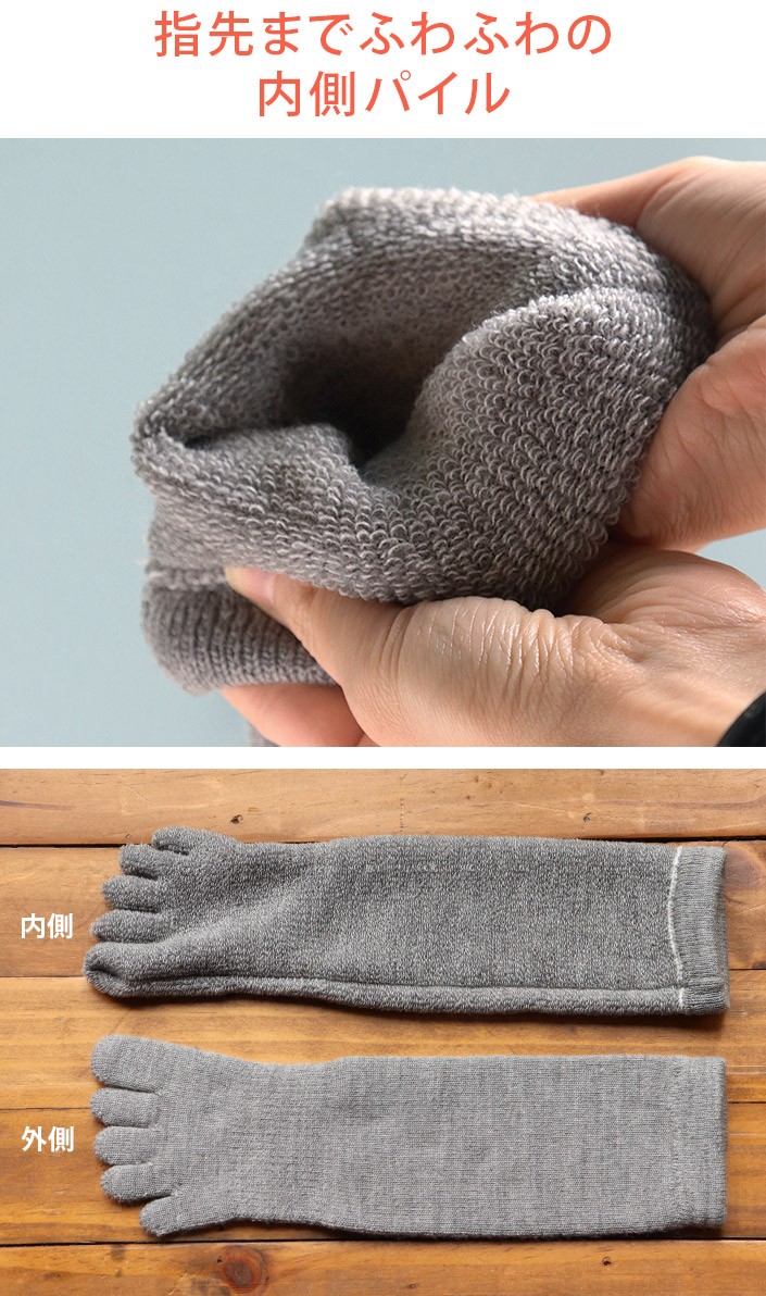 肌に触れる内側は、指先までふわふわのパイル生地になっています。あたたかな空気をたっぷり含んでくれるので、保温性も履き心地の良さもばつぐんです。