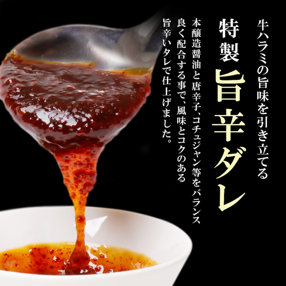 味付け牛ハラミ(牛ハラミ(アイルランド)、食塩、香辛料)、たれ(醤油、砂糖、還元水あめ、唐辛子、コチジャン、その他)、にんにく/調味料(アミノ酸等)、ソルビトール、増粘剤(加工デンプン、キサンタンガム)、pH調整剤、酸化防止剤(V.C)、酸味料、着色料(カロチノイド、カラメル)、甘味料(スクラロース)、酵素、(一部に牛肉・小麦・大豆を含む)