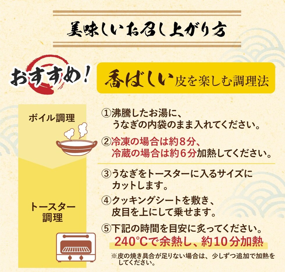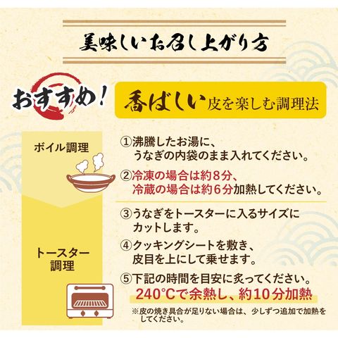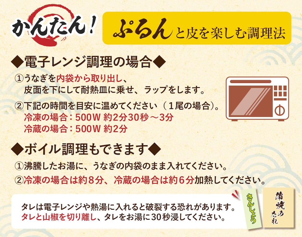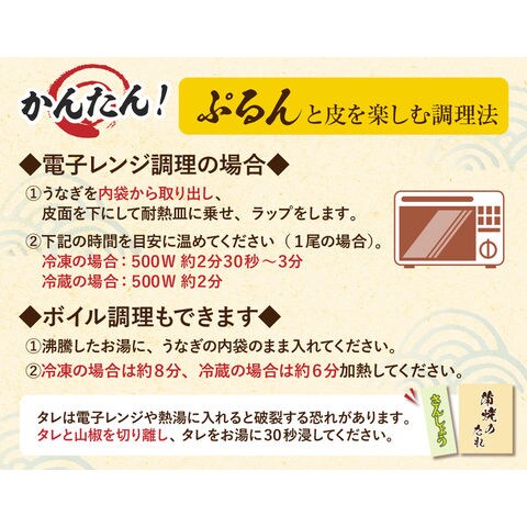 1.沸騰したたっぷりのお湯に、凍ったままのうなぎを袋ごと入れ、フタをせずに中火で約8分温めてください。 または、うなぎを袋から取り出し、お皿に移してラップをかけて、電子レンジで加熱してください(500w 約2分30秒)。