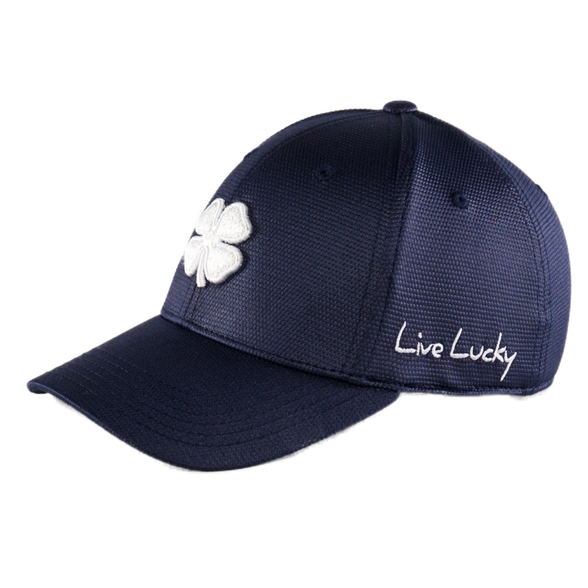 伸縮性のある素材に、大型立体形のクローバー刺繍を前面に配置したキャップ。