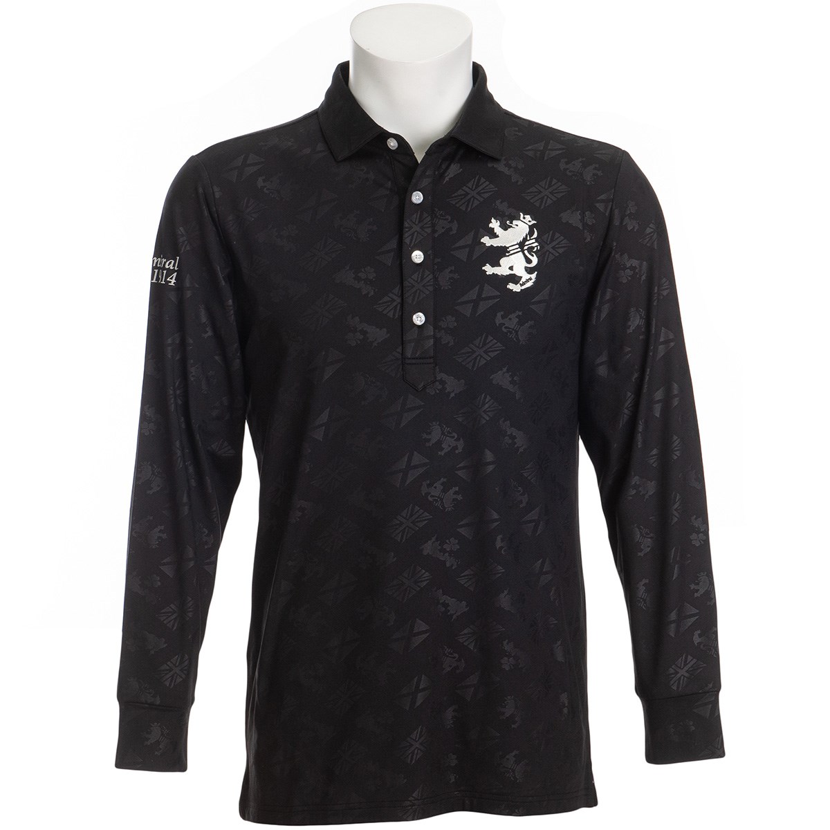アイルランドモチーフやユニオンジャック、ランパントなどのモチーフをエンボス加工にて表現した保温ストレッチワイドカラー長袖ポロシャツ。