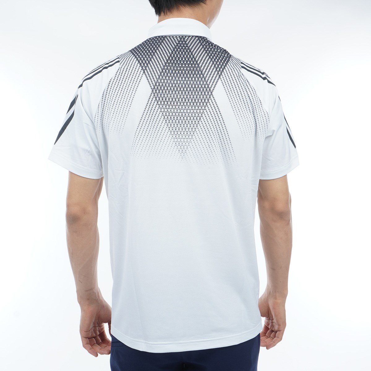 ソリッドなアイテムでありながら、襟先のADIDASロゴと後身頃のジオメトリックプリントが商品の存在感を昇華させています。