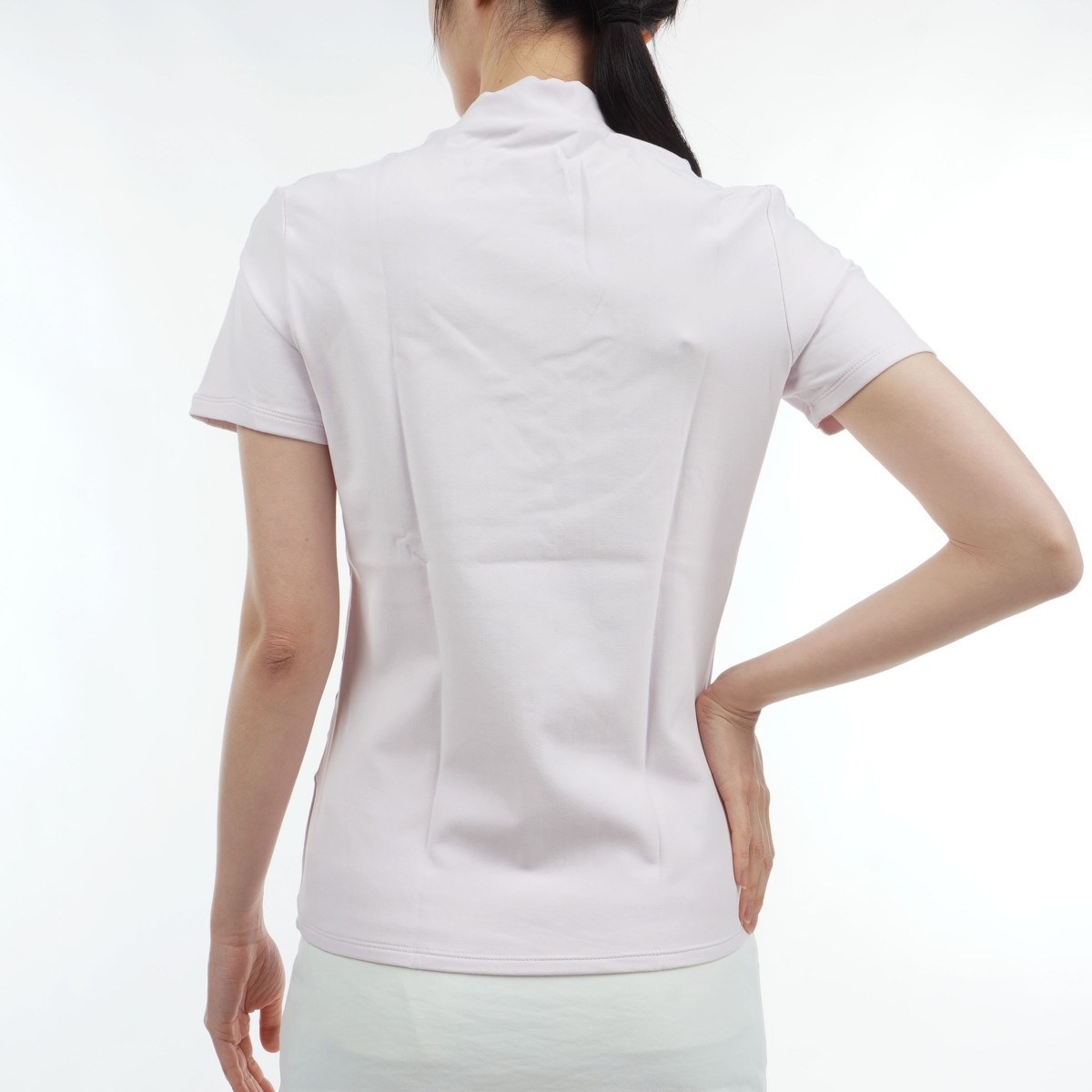 ナイロンの滑らかなタッチの素材を使用した半袖モックネックシャツ。