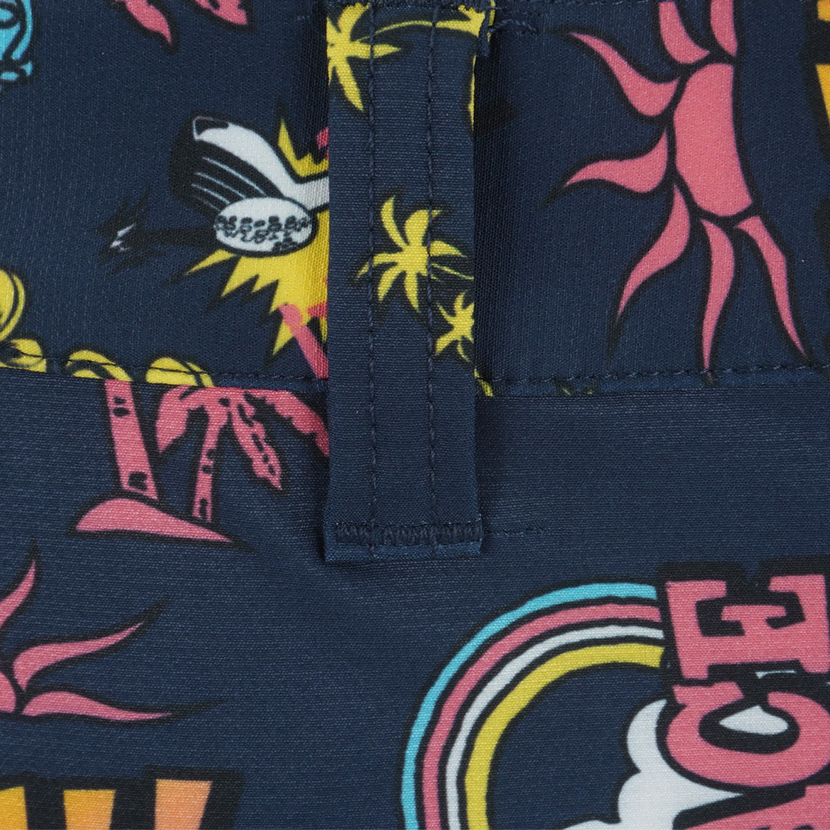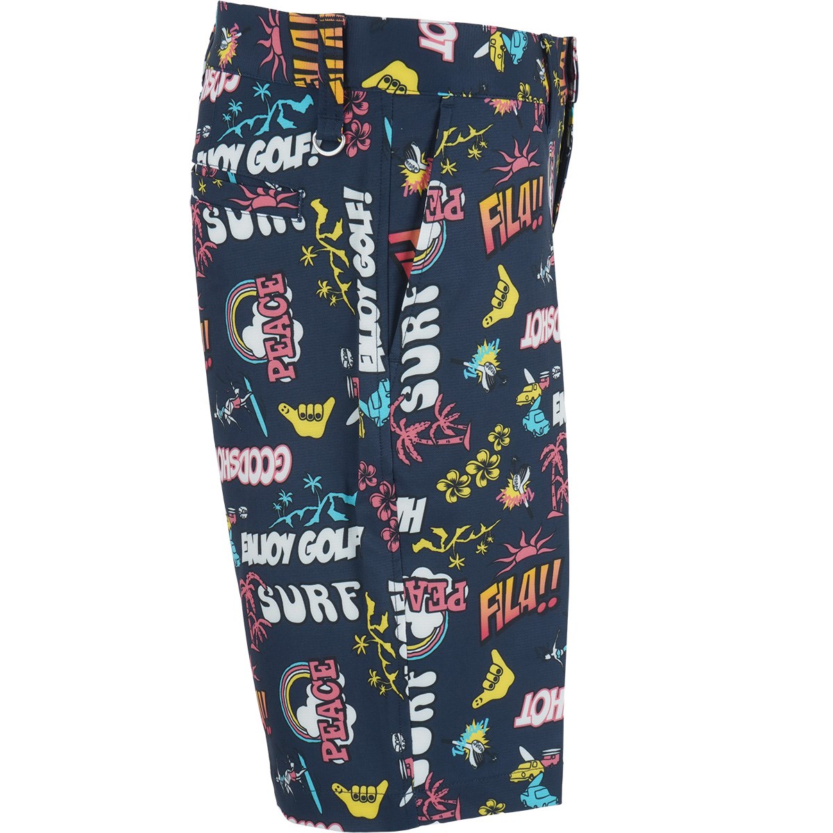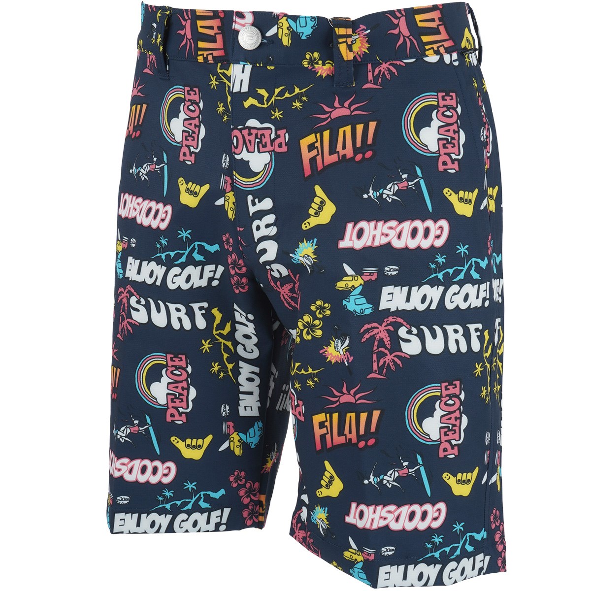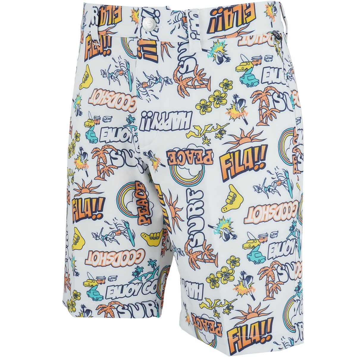 二重織ストレッチの素材にFILAらしいポップなアロハコミック柄をプリントしたショートパンツ。