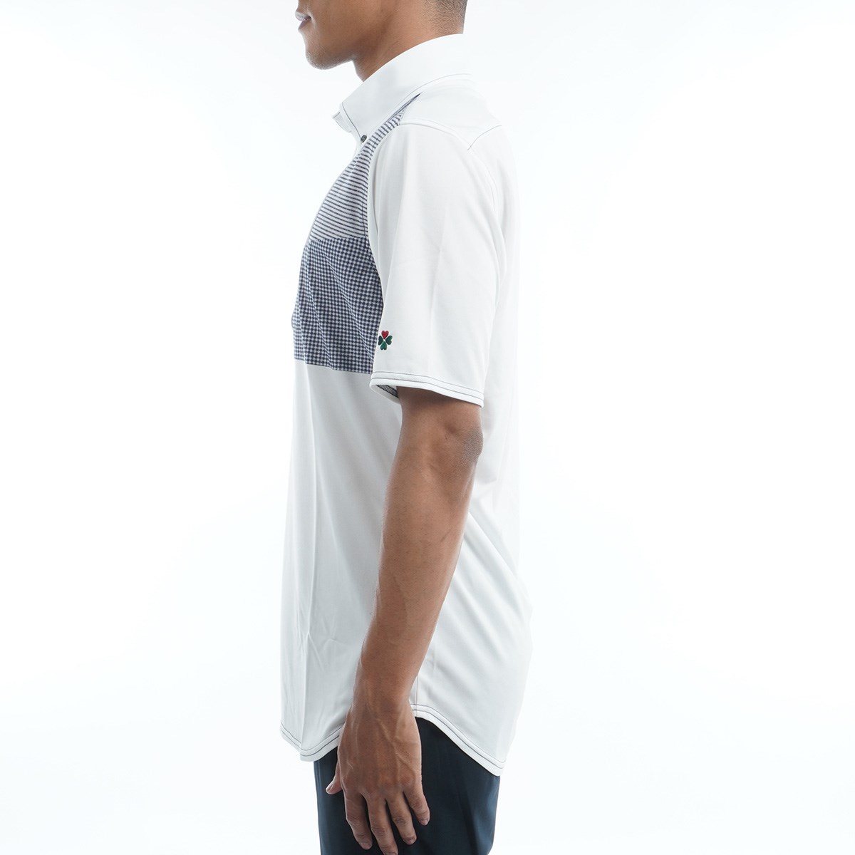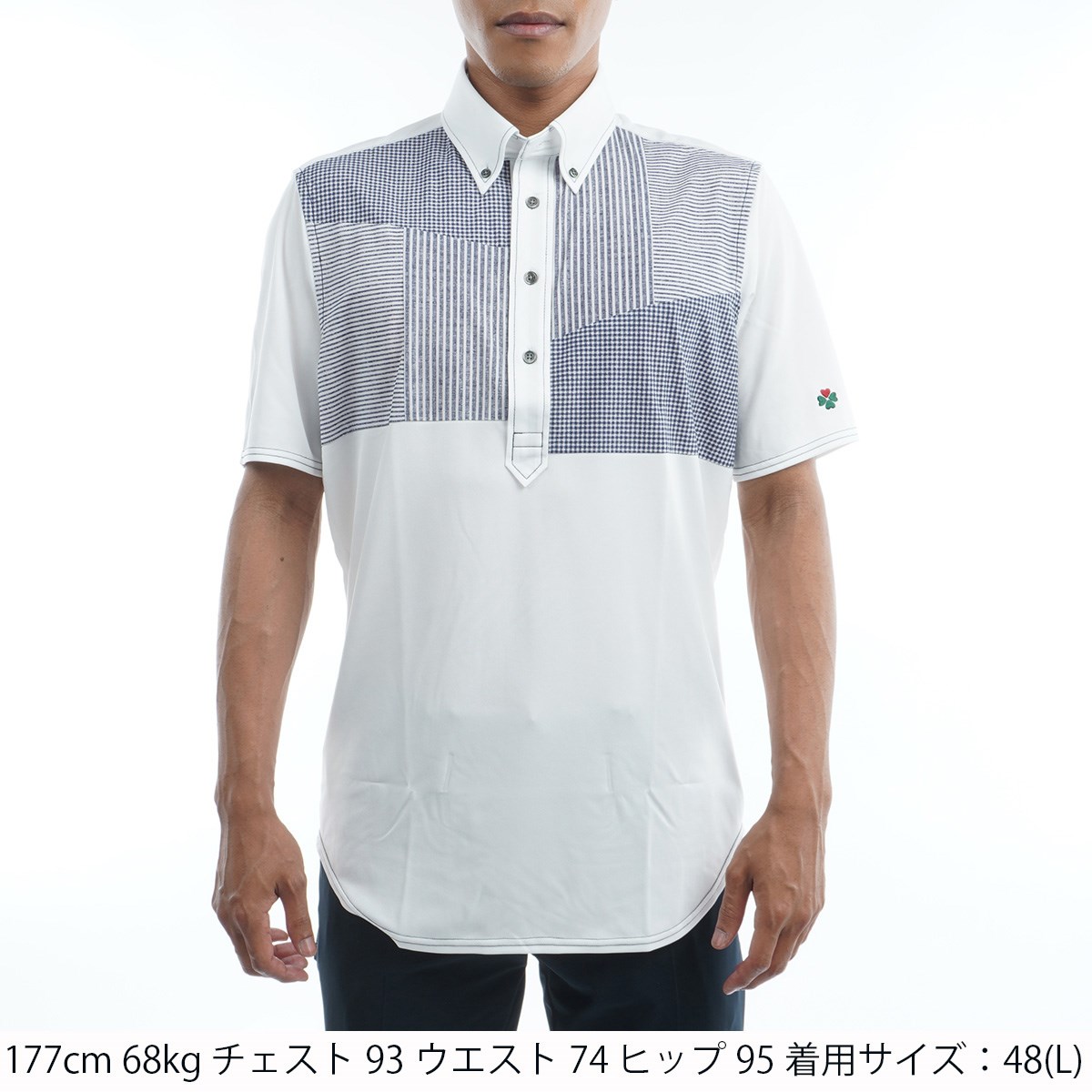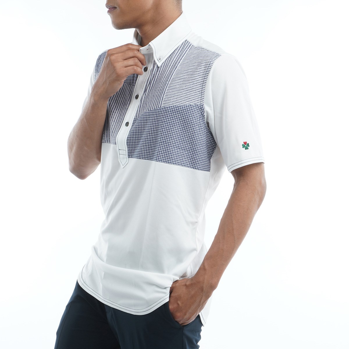 ボディーに吸汗速乾スムース素材を使用、胸に3種類の生地を嵌め込んだ小粋でウエストをシェイプしたボタンダウン半袖ポロシャツ。