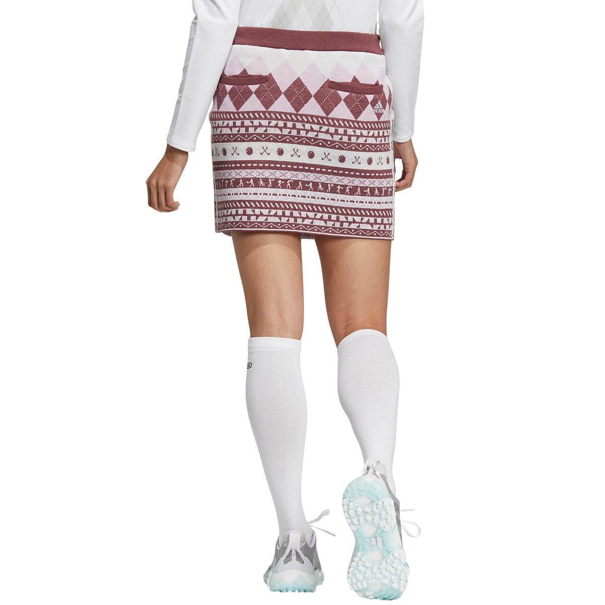 製品全体に伝統的な柄の一つでもあるフェアアイル柄とアーガイル柄にゴルフのエッセンスを加えた、非常にユニークな柄使いのニットスカートです。