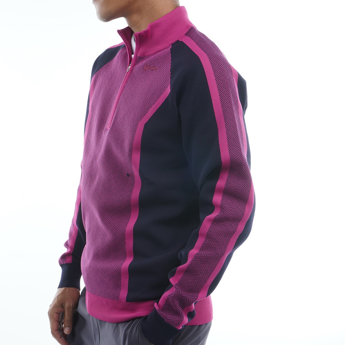 細線のクロス柄をパネルで表現したハーフジップセーター。