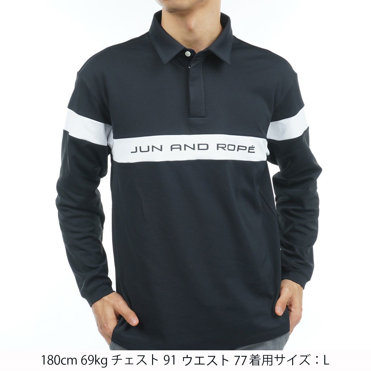 胸切替にJUN&ROPEのロゴ、あるいはモノグラムプリントの切替が入った長袖ポロシャツ。