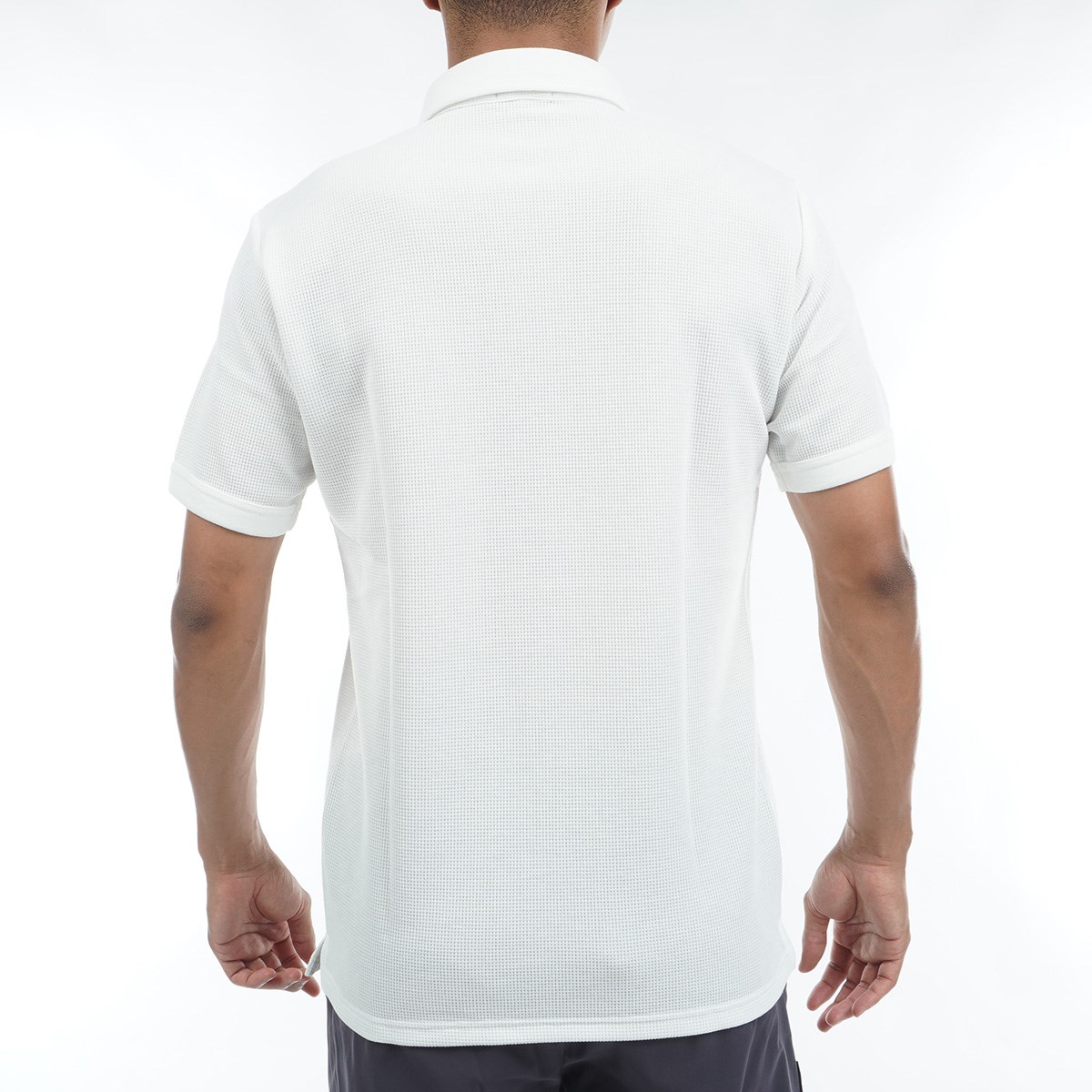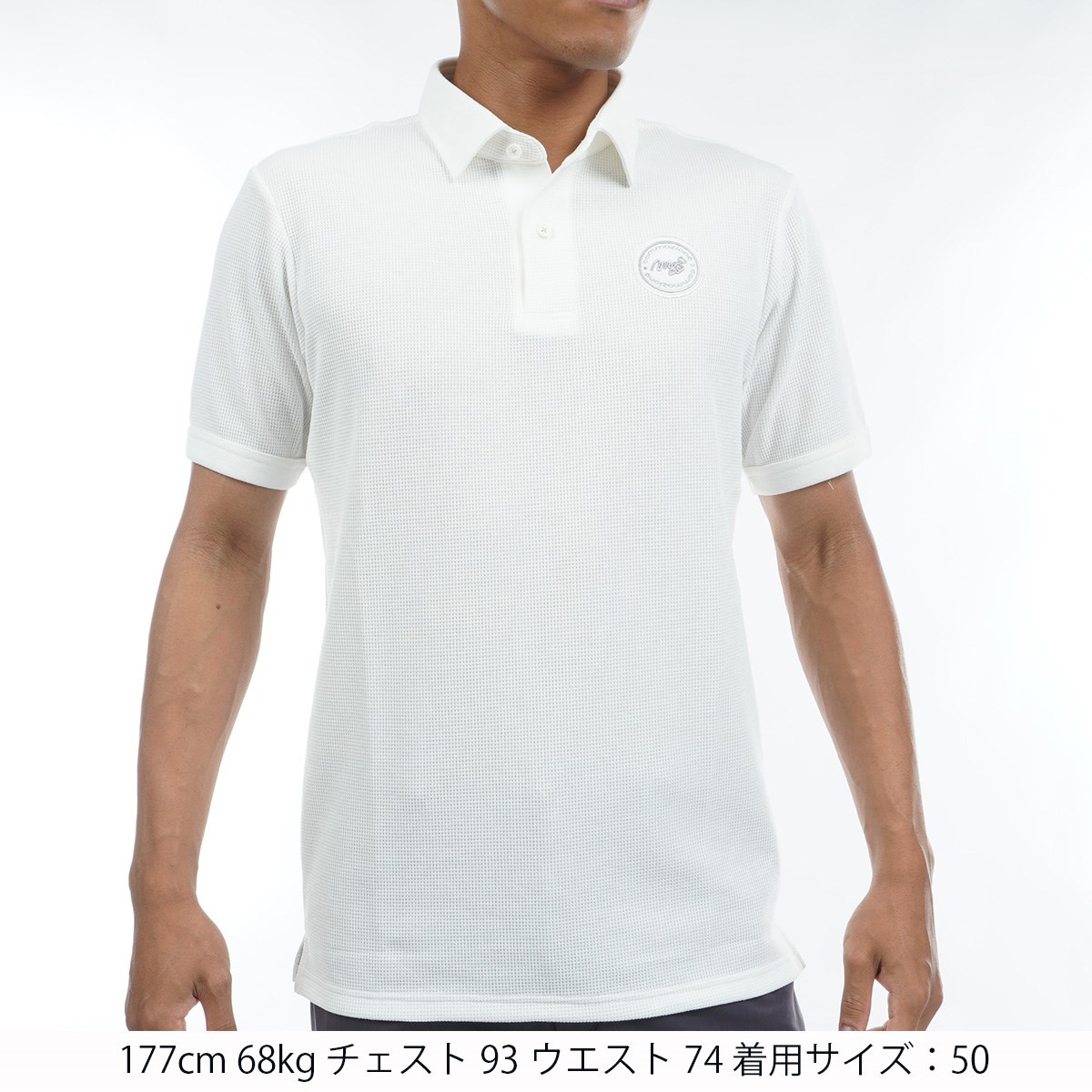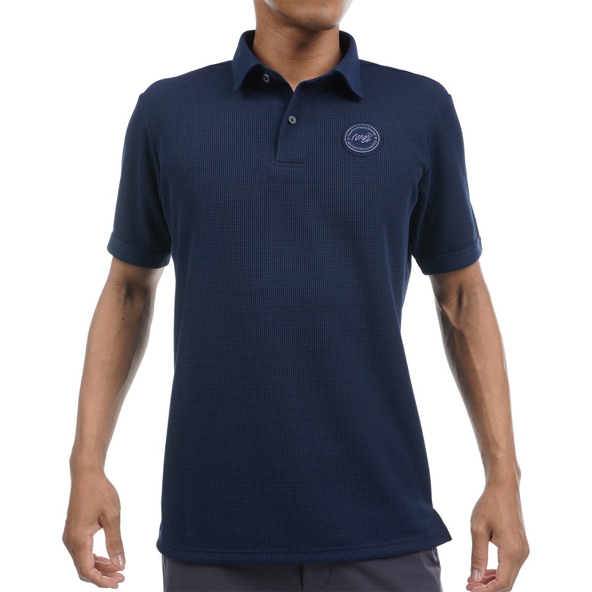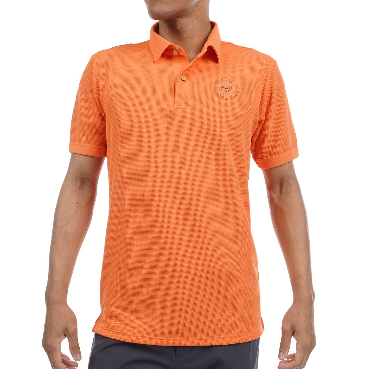 本体はコットンライクポリエステル「policott®」の30番手のワッフルで、衿と下前立てや袖口のトリミングや左胸のアプリケなどに本体生地と同じ原料で編んだフライスを使用しており、衿の縁にはあえてステッチをかけず、ラフに仕上げています。