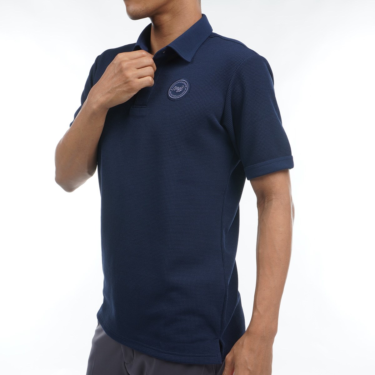 本体はコットンライクポリエステル「policott®」の30番手のワッフルで、衿と下前立てや袖口のトリミングや左胸のアプリケなどに本体生地と同じ原料で編んだフライスを使用しており、衿の縁にはあえてステッチをかけず、ラフに仕上げています。