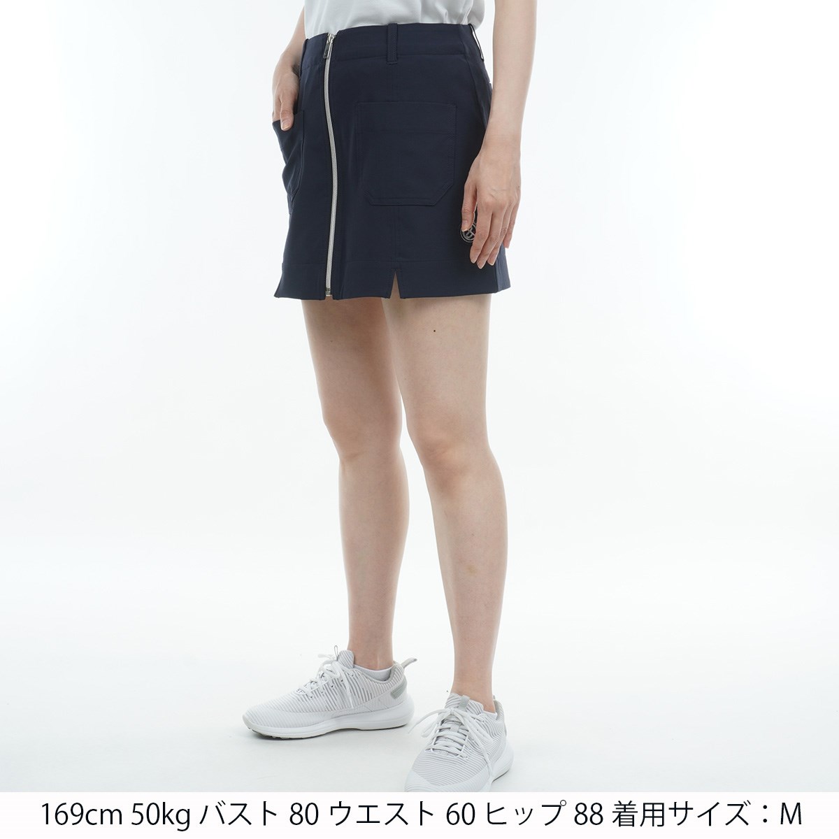 シンプルな台形シルエットで、フロントファスナーとポケットデザインがアクセントのアイテムです。