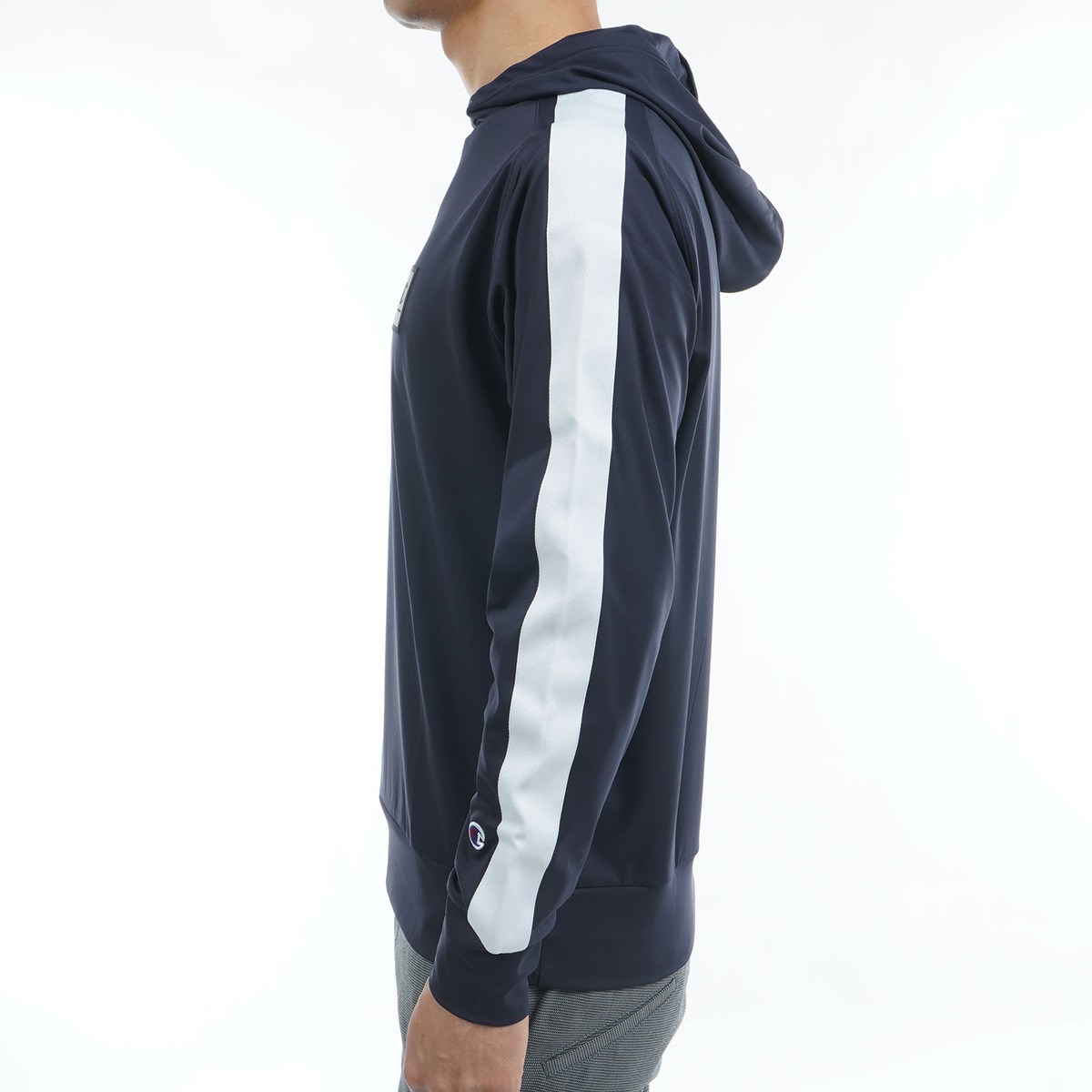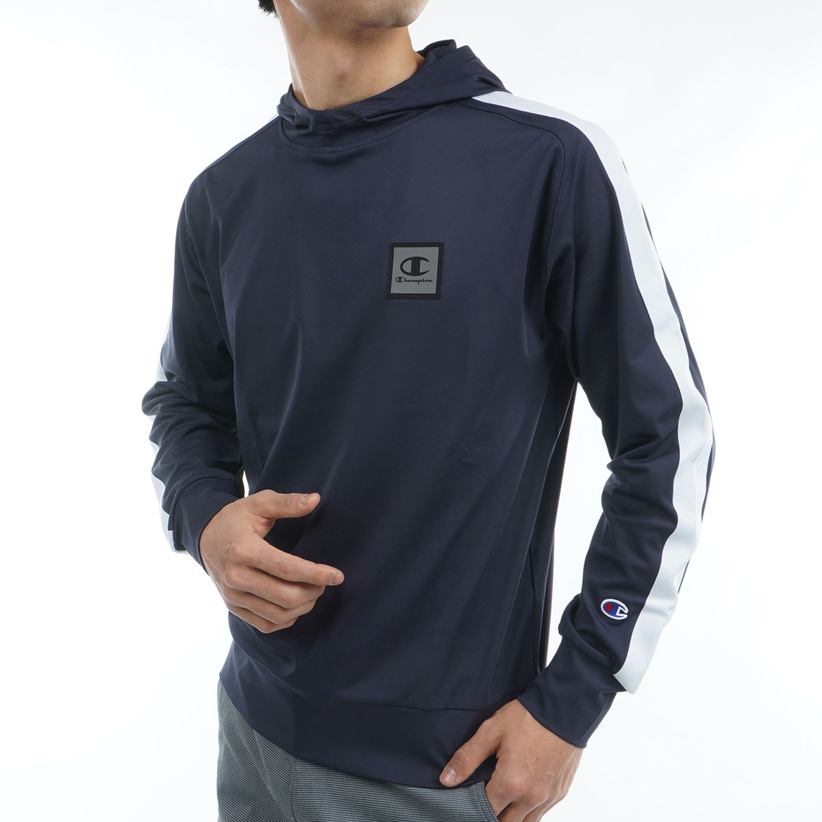 胸にCロゴとChampion(チャンピオン)のコンビネーションロゴのシリコンワッペン、フードにはChampionロゴをラバープリントで入れています。