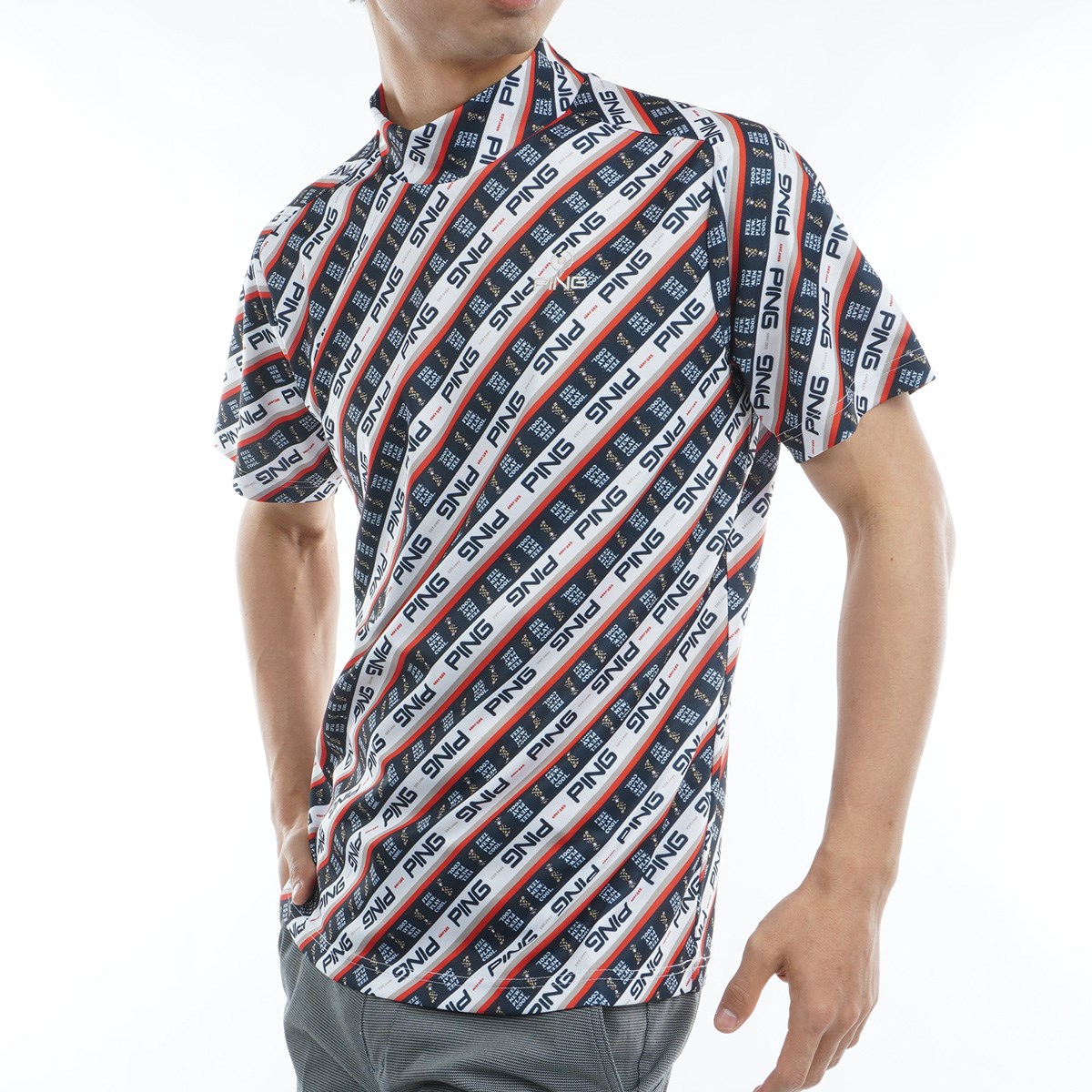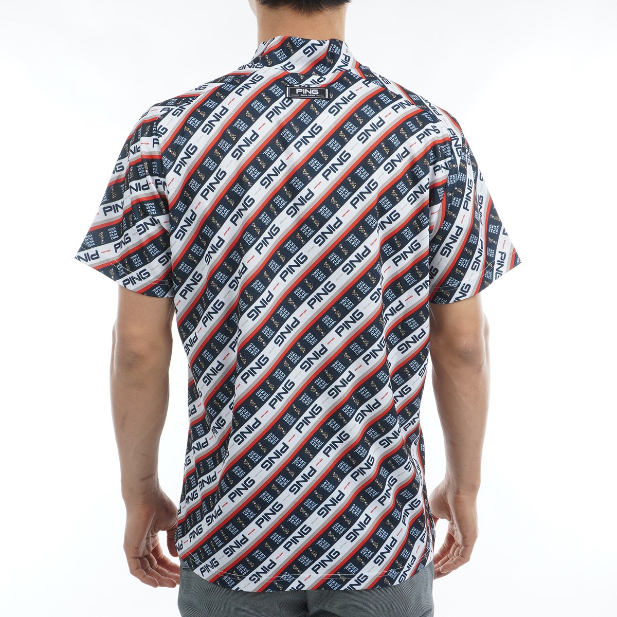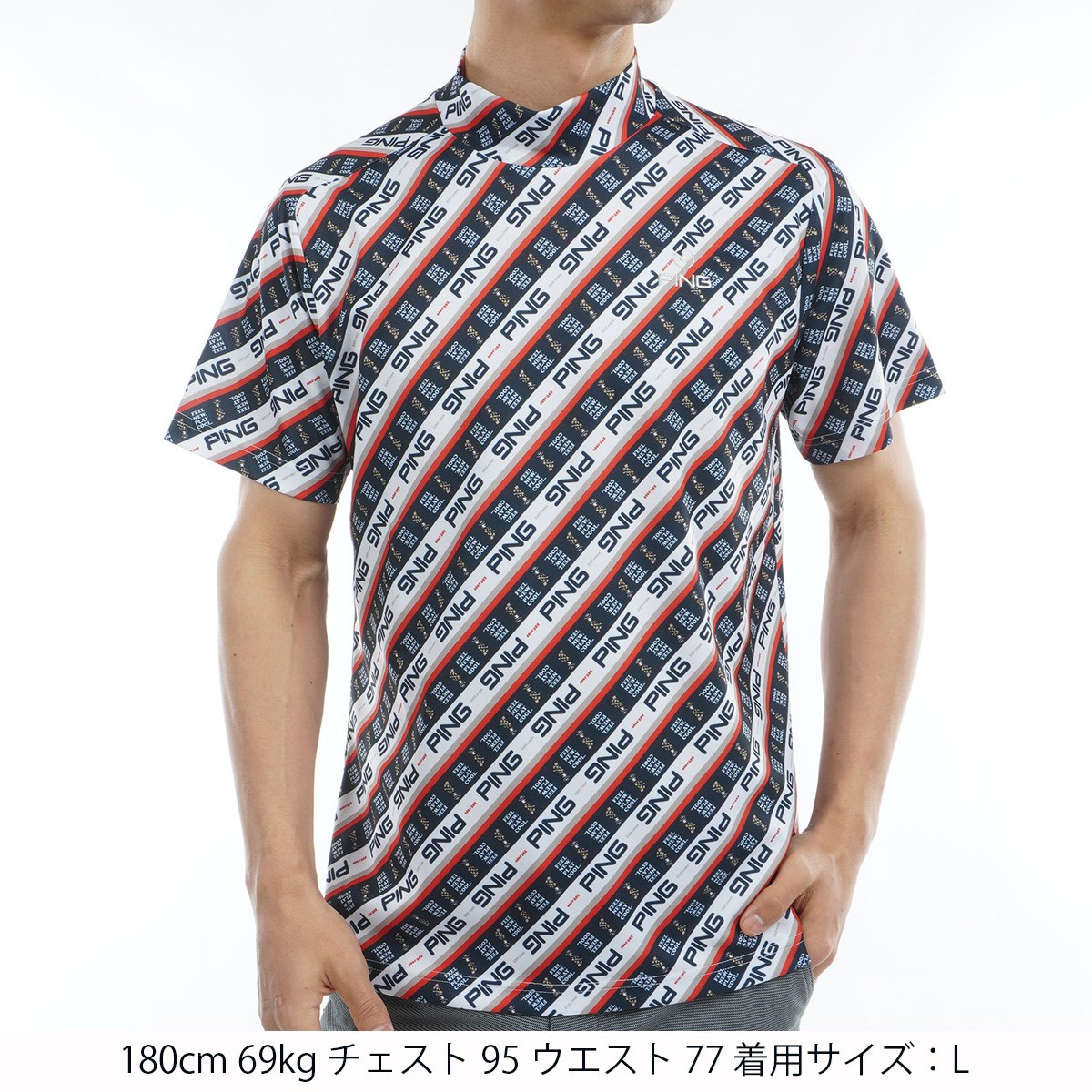 ピン PING GDO限定 ロゴバイアスプリント 鹿の子ハイネック半袖シャツ 3L レッド 100