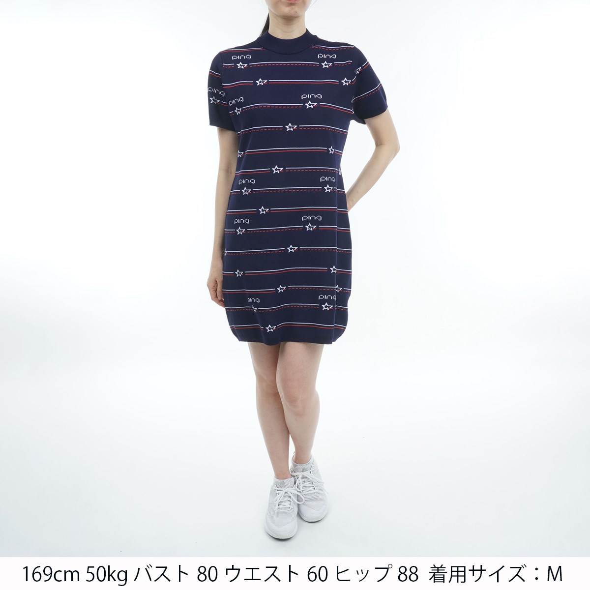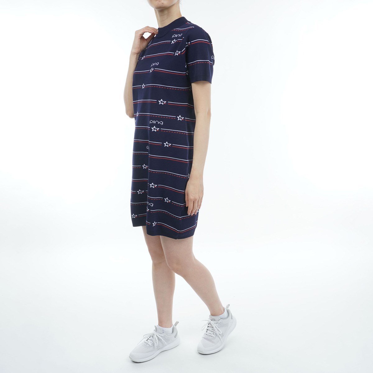 【PING APPAREL】アリゾナボーダージャガードモックネックニットワンピース <NATIVE> (LADIES)レディースならではの小文字のpingロゴや星柄を用いて新鮮なボーダー柄を表現した、アリゾナボーダージャガードモックネックニットワンピース。ドライタッチな風合いが特徴の、軽くて吸水速乾性の良いポリエステル素材を使用しています。アリゾナをインスパイアした総柄でインパクトを与えた、一枚で旬なゴルフコーデを実現するアイテムです。