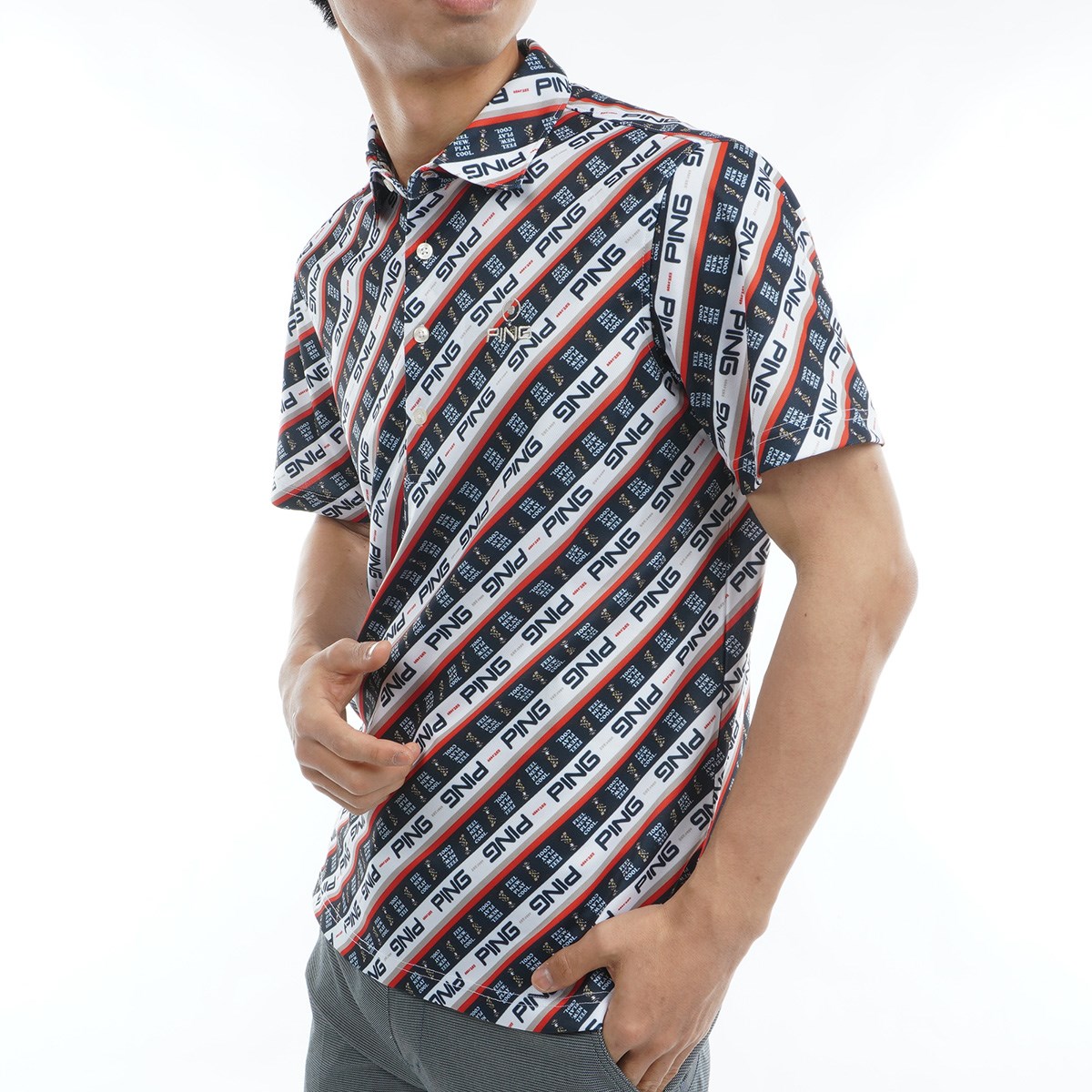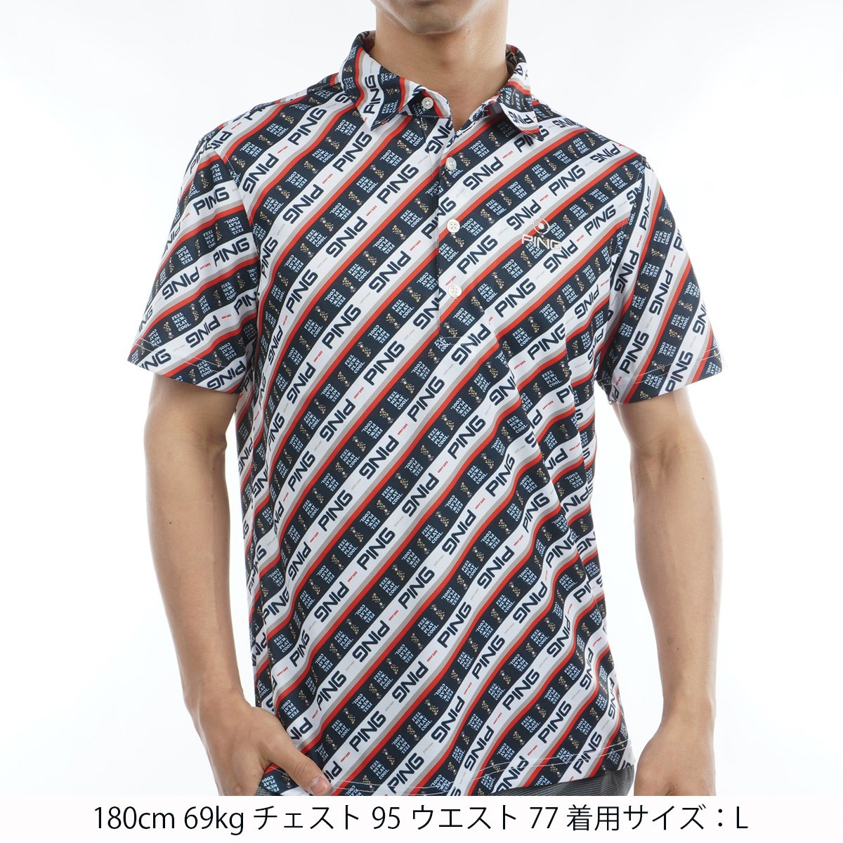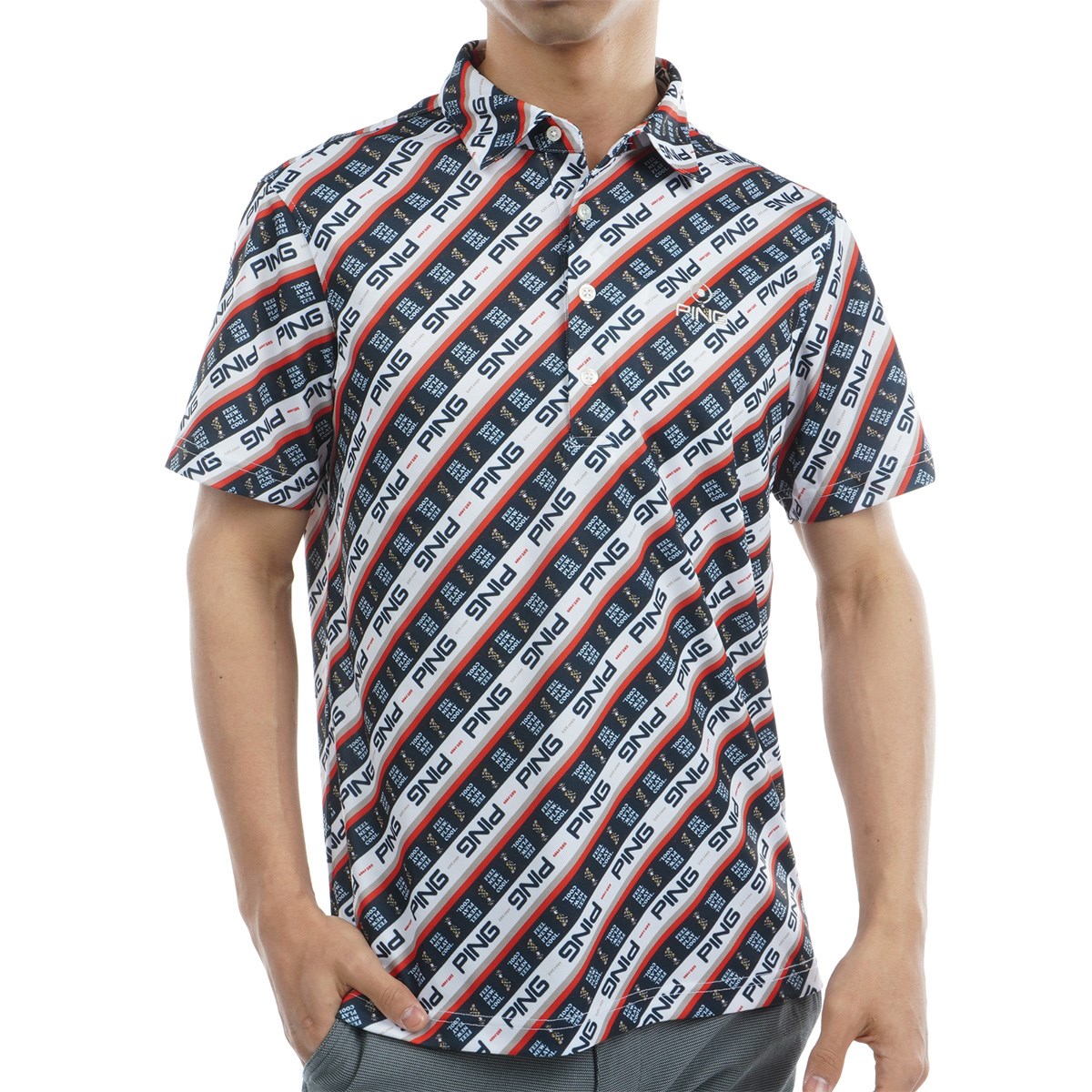 【PING APPAREL】ロゴバイアスプリント 半袖カノコポロシャツ <NATIVE> (MENS)スタイリングに遊び心とインパクトを与える、Mr.PINGバイアスプリント半袖カノコポロシャツ。さまざまなパターンのロゴとMr.PINGを組み合わせてカラフルなバイアスプリントを表現した、パッと目を惹く半袖ポロシャツです。凸凹形状のカノコ生地は通気性と吸水速乾性に優れているので、汗をかいてもムレにくく快適な着用感を保ちます。幅広い年代の方にご愛用いただけますよう、Sサイズから4Lサイズの豊富なサイズ展開で登場しました。