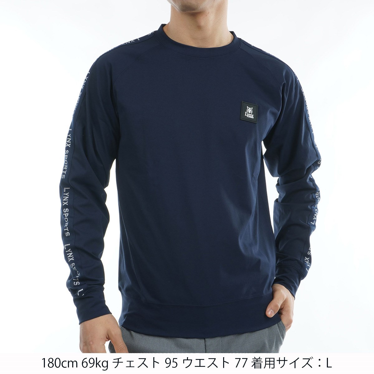 リンクススポーツのロゴラインがラグランスリーブラインにテーピングされた、シンプルなクルートレーナー。