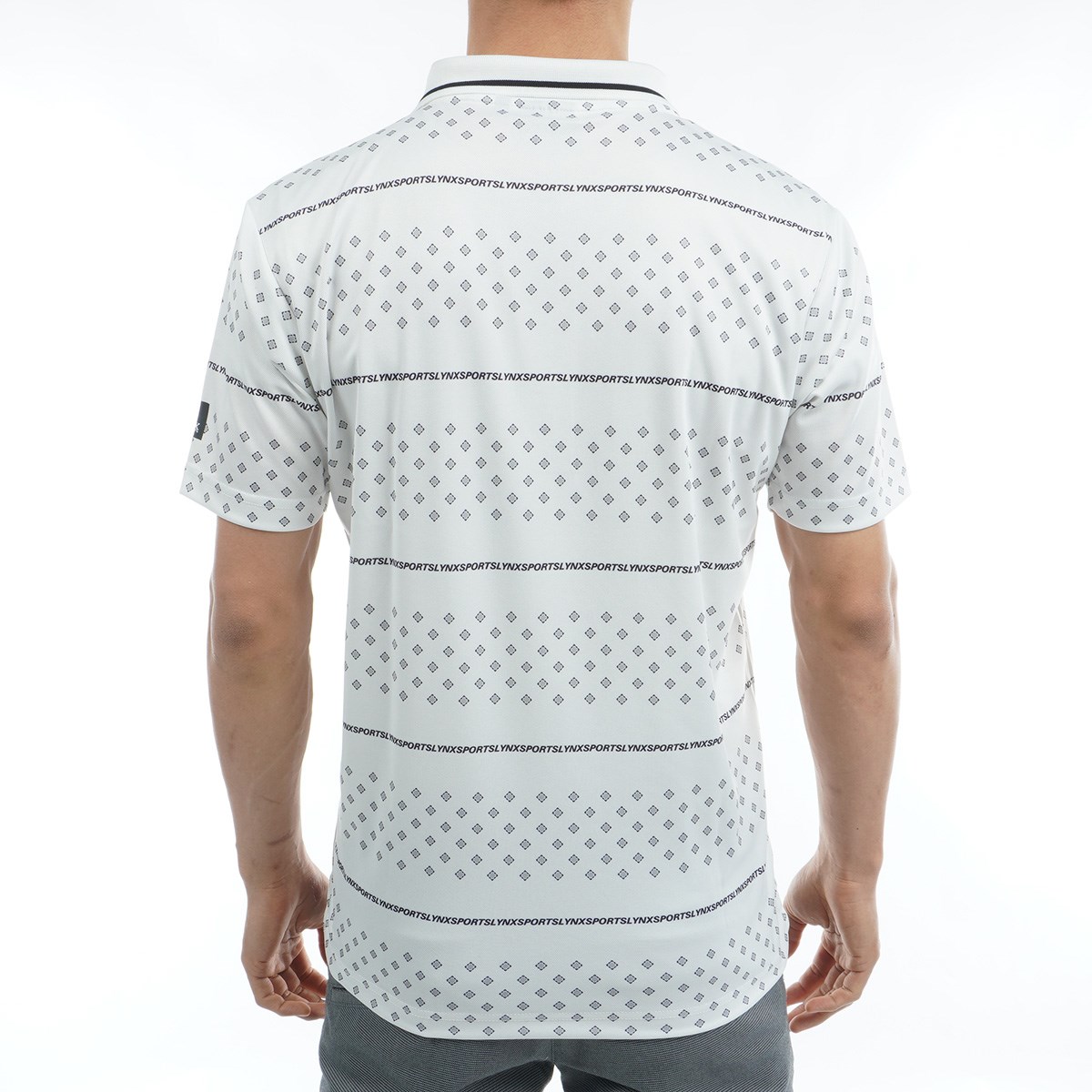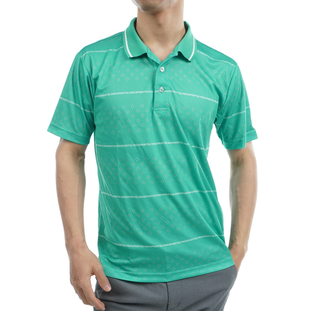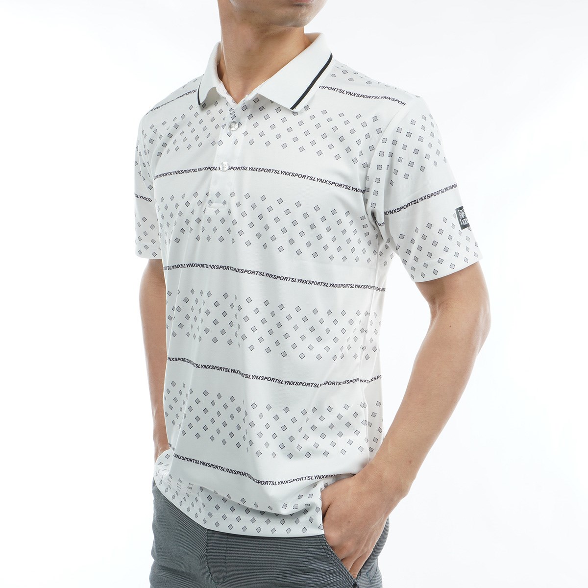 LYNX SPORTSロゴとスモールパターンが交互にボーダー見えするプリント半袖ポロシャツです。