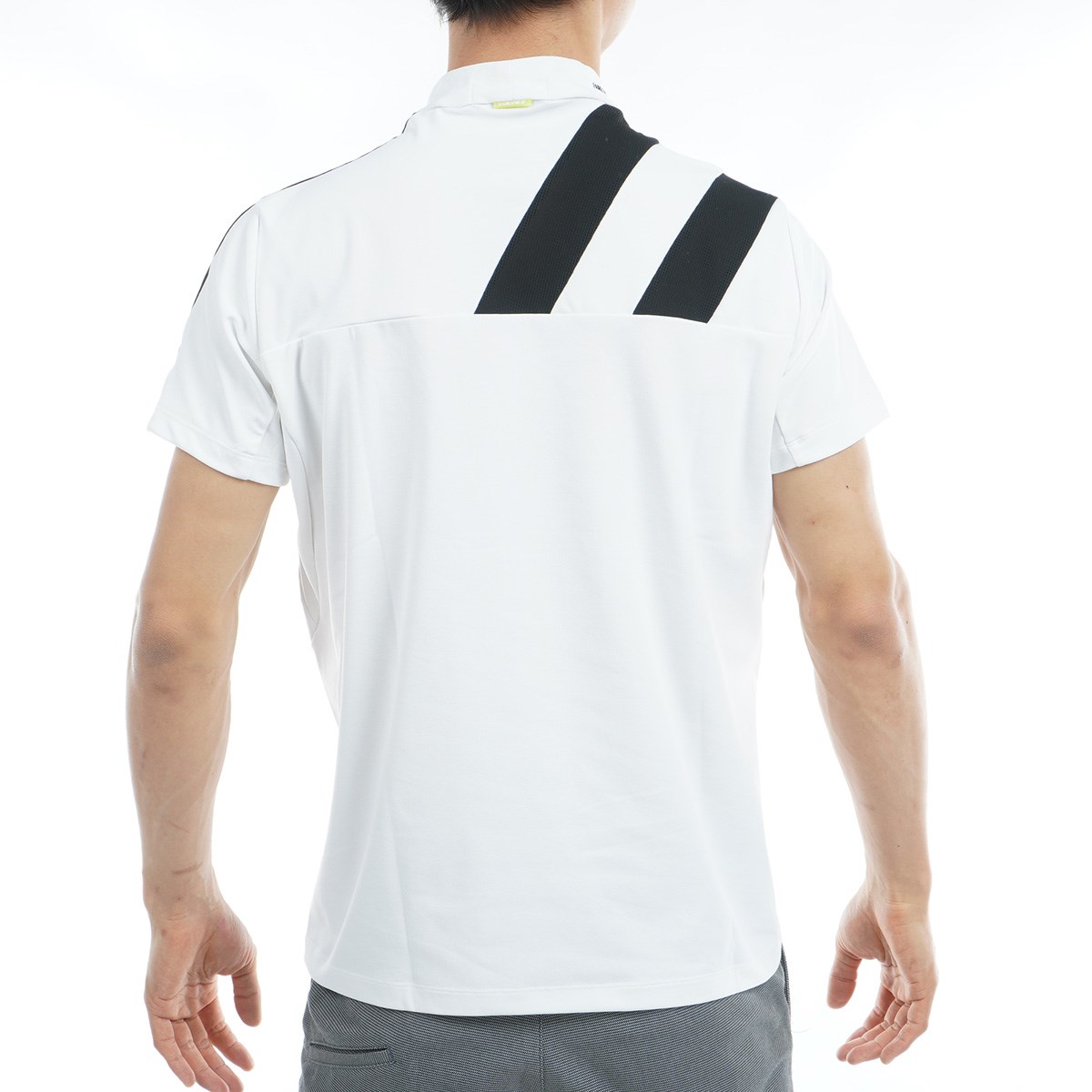 再生ポリエステルの鹿の子素材を使用したモックネック半袖シャツ。