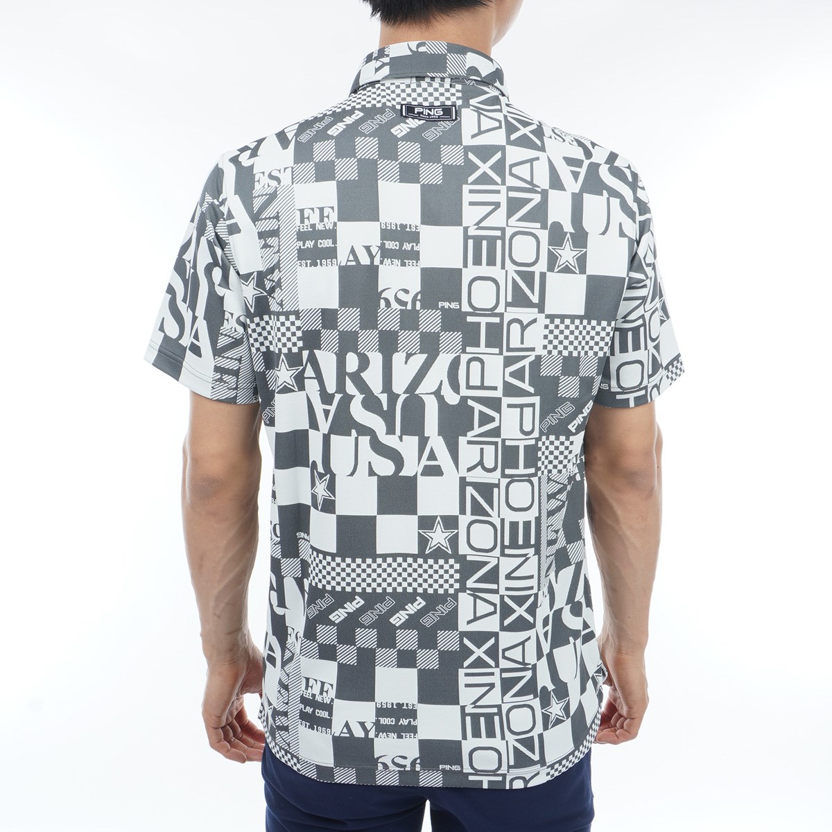 【PING APPAREL】アリゾナダミエ 半袖ジャガードポロシャツ <NATIVE> (MENS)サイズ違いのダミエやロゴなどレイアウトやフォントに変化をつけて個性的にデザインされた、アリゾナダミエ半袖ジャガードポロシャツ。PING発祥地であるアリゾナを総柄で表現した、インパクトたっぷりのポロシャツです。ドライでハリ感がある凸凹形状の生地なので、通気性と吸水速乾性に優れた軽い着心地を保ちます。着ることで楽しさが増すような、アクティブ感のあるPINGらしい爽やかな印象を演出できます。さまざまな年代のプレイヤーに着用していただけるように、Sから4Lまでの豊富なサイズ展開でご用意させていただいております。