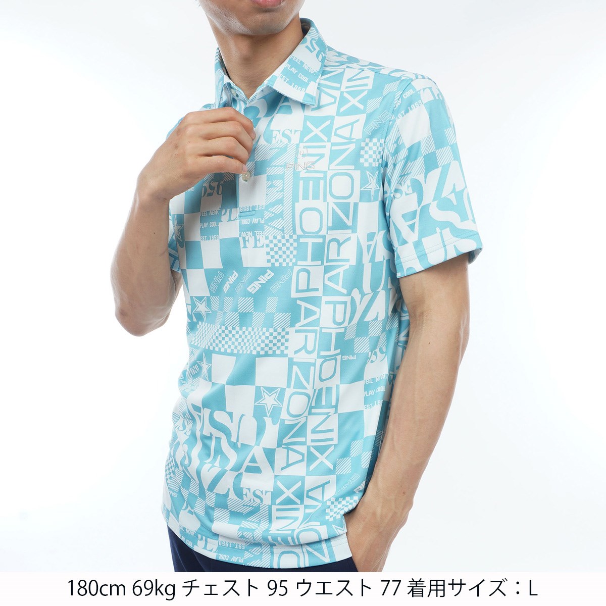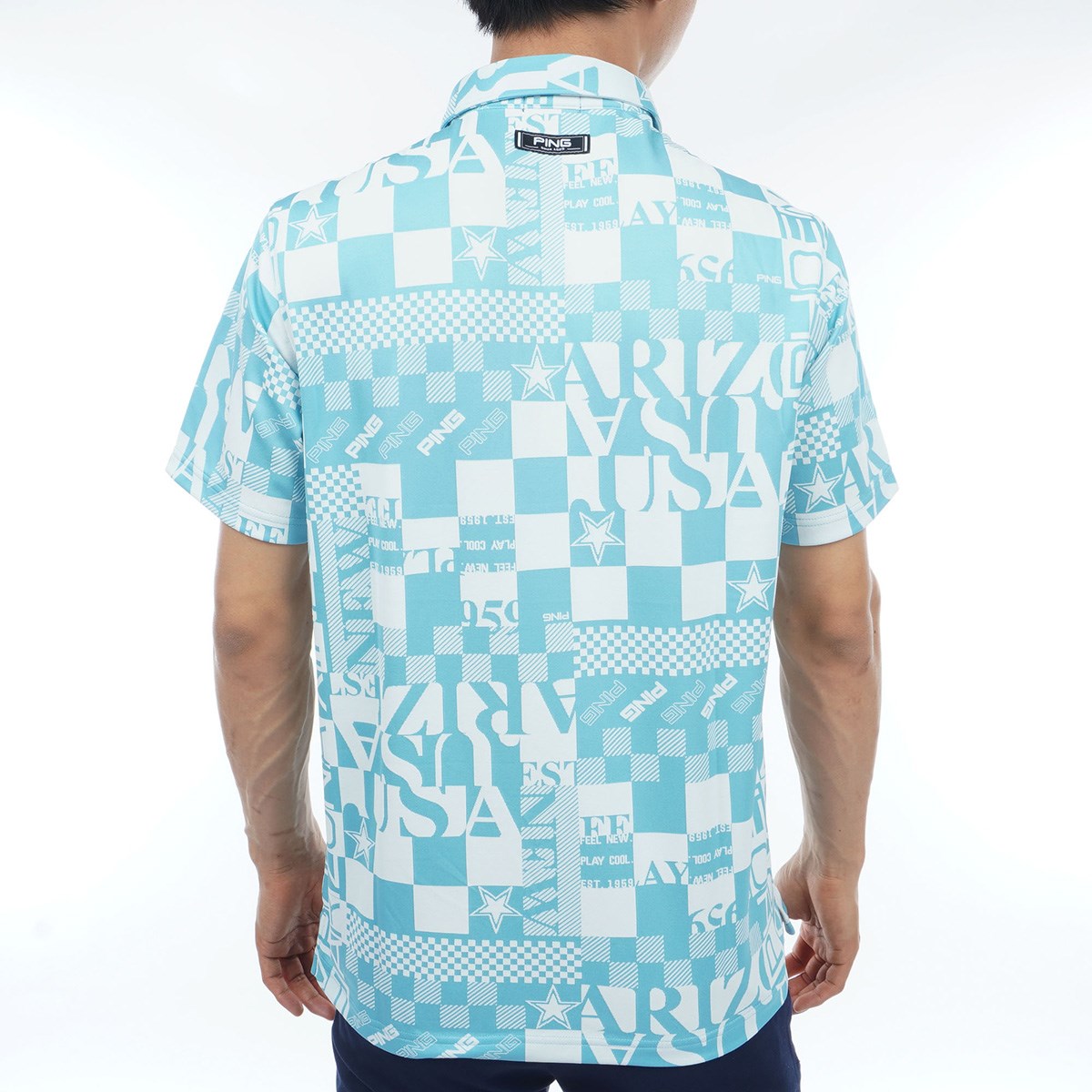 【PING APPAREL】アリゾナダミエ 半袖ジャガードポロシャツ <NATIVE> (MENS)サイズ違いのダミエやロゴなどレイアウトやフォントに変化をつけて個性的にデザインされた、アリゾナダミエ半袖ジャガードポロシャツ。PING発祥地であるアリゾナを総柄で表現した、インパクトたっぷりのポロシャツです。ドライでハリ感がある凸凹形状の生地なので、通気性と吸水速乾性に優れた軽い着心地を保ちます。着ることで楽しさが増すような、アクティブ感のあるPINGらしい爽やかな印象を演出できます。さまざまな年代のプレイヤーに着用していただけるように、Sから4Lまでの豊富なサイズ展開でご用意させていただいております。