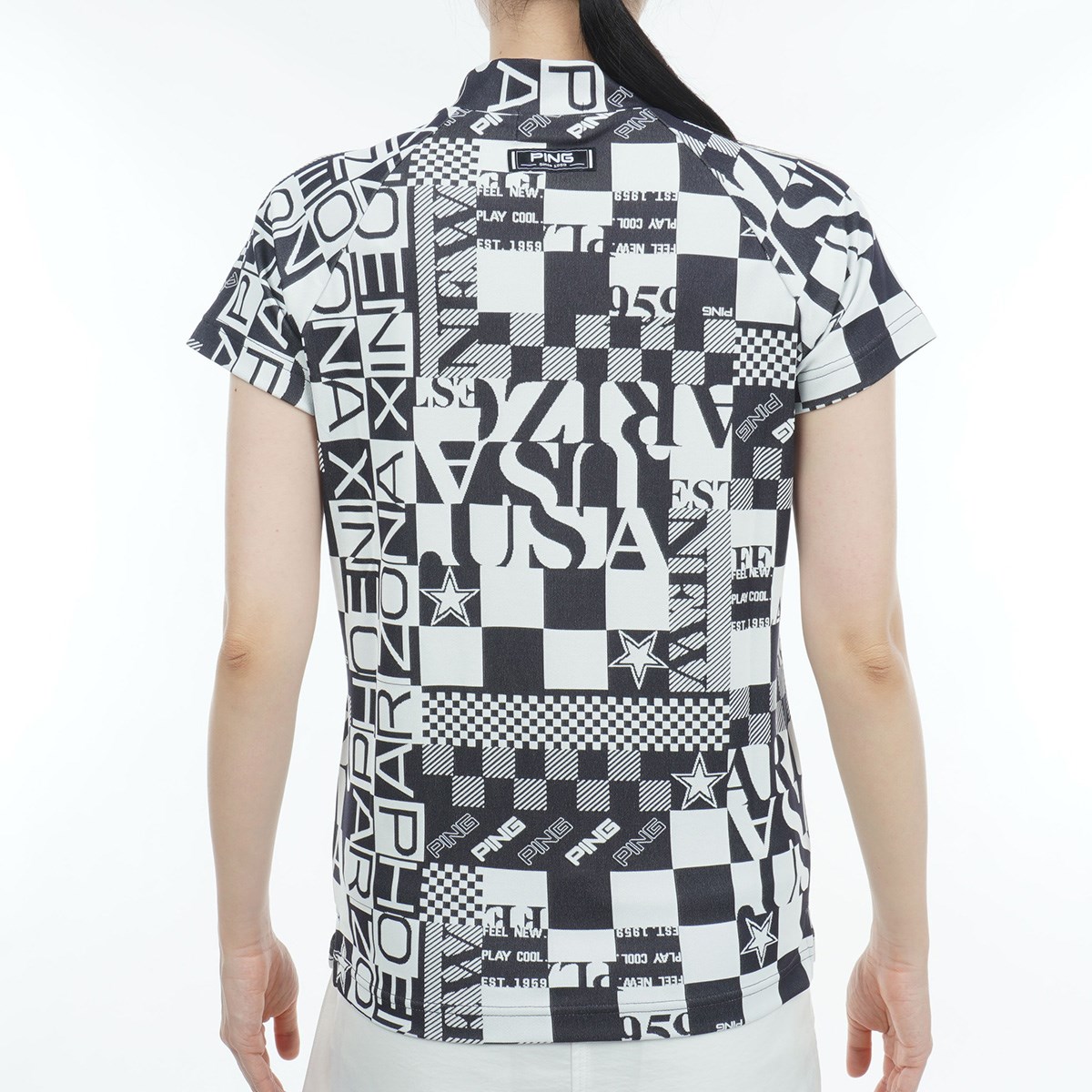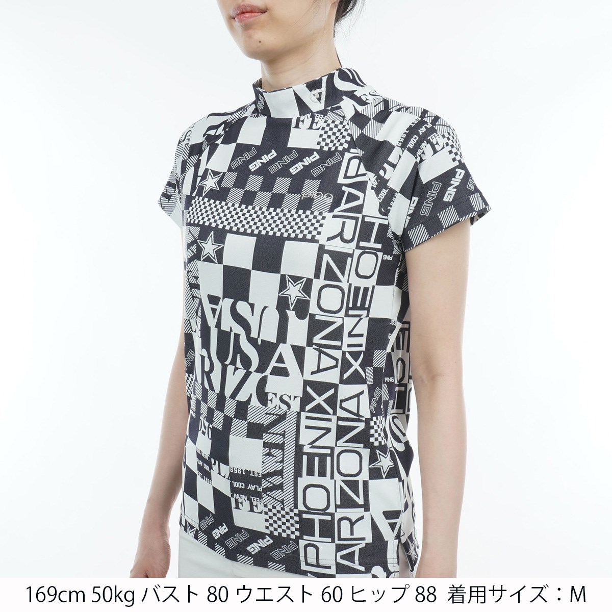 【PING APPAREL】アリゾナダミエ 半袖ジャガードハイネックカットソー <NATIVE> (LADIES)サイズ違いのダミエやロゴなどレイアウトやフォントに変化をつけて個性的にデザインされた、アリゾナダミエ半袖ジャガードハイネックカットソー。PING発祥地であるアリゾナを総柄で表現した、インパクトたっぷりのカットソーアイテムです。ドライでハリ感がある凸凹形状の生地なので、通気性と吸水速乾性に優れた軽い着心地を保ちます。着ることで楽しさが増すような、アクティブ感のあるPINGらしい爽やかな印象を演出できます。さまざまな年代のプレイヤーに着用していただけるように、SSからLLまでの豊富なサイズ展開でご用意させていただいております。