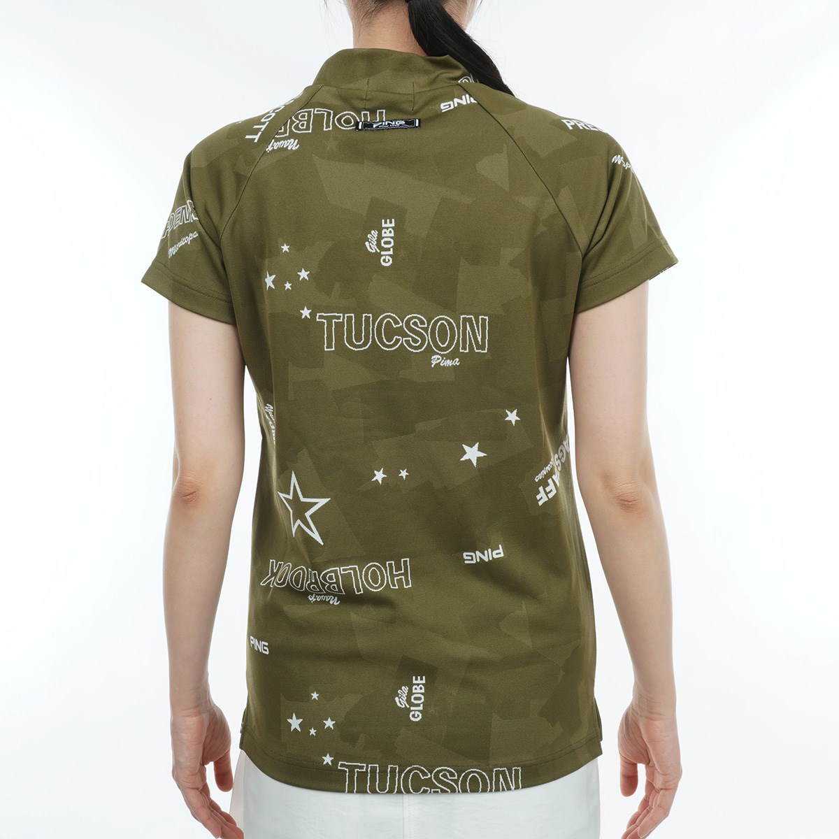【PING APPAREL】カモフラージュ柄 半袖ジャガードハイネックカットソー <NATIVE> (LADIES)星柄やロゴなどレイアウトやフォントに変化をつけて個性的にデザインされた、アリゾナカモフラージュ柄の半袖ジャガードハイネックカットソー。PING発祥地であるアリゾナを想起させる、インパクトたっぷりのカットソーアイテムです。ドライでハリ感がある凸凹形状の生地なので、通気性と吸水速乾性に優れた軽い着心地を保ちます。着ることで楽しさが増すような、アクティブ感のあるPINGらしい爽やかな印象を演出できます。