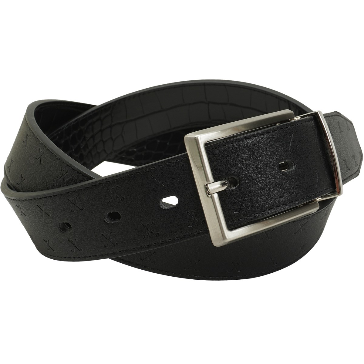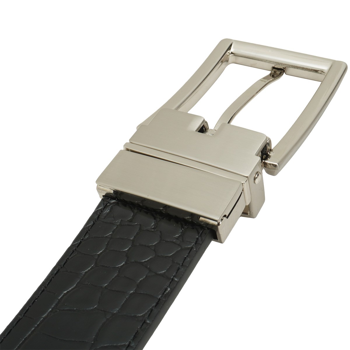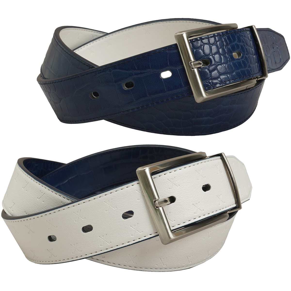 エンボスで表現したクロスクラブ柄と、クロコ柄の両面を使用できるリバーシブルベルト。