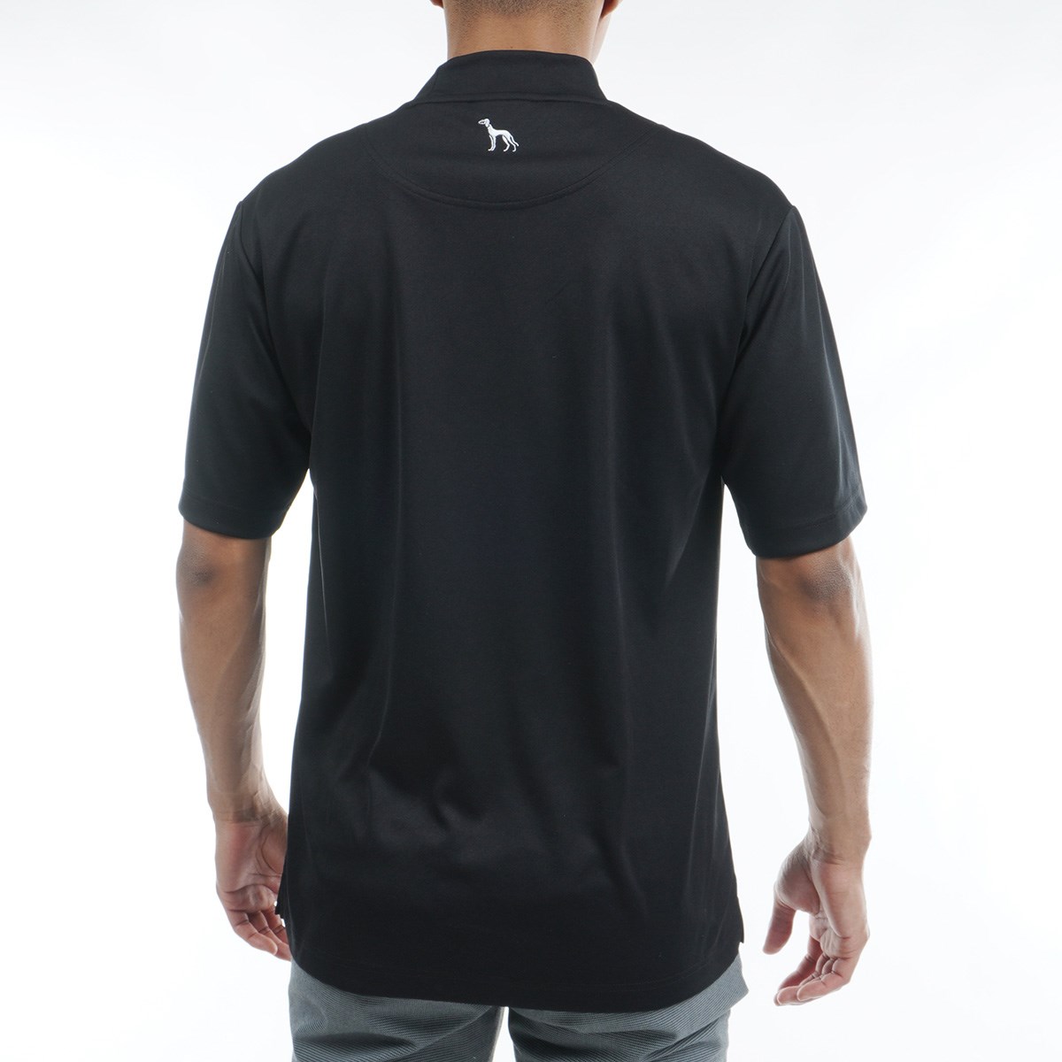 動きのあるロゴを胸正面に大きく入れたモックネック半袖シャツ。