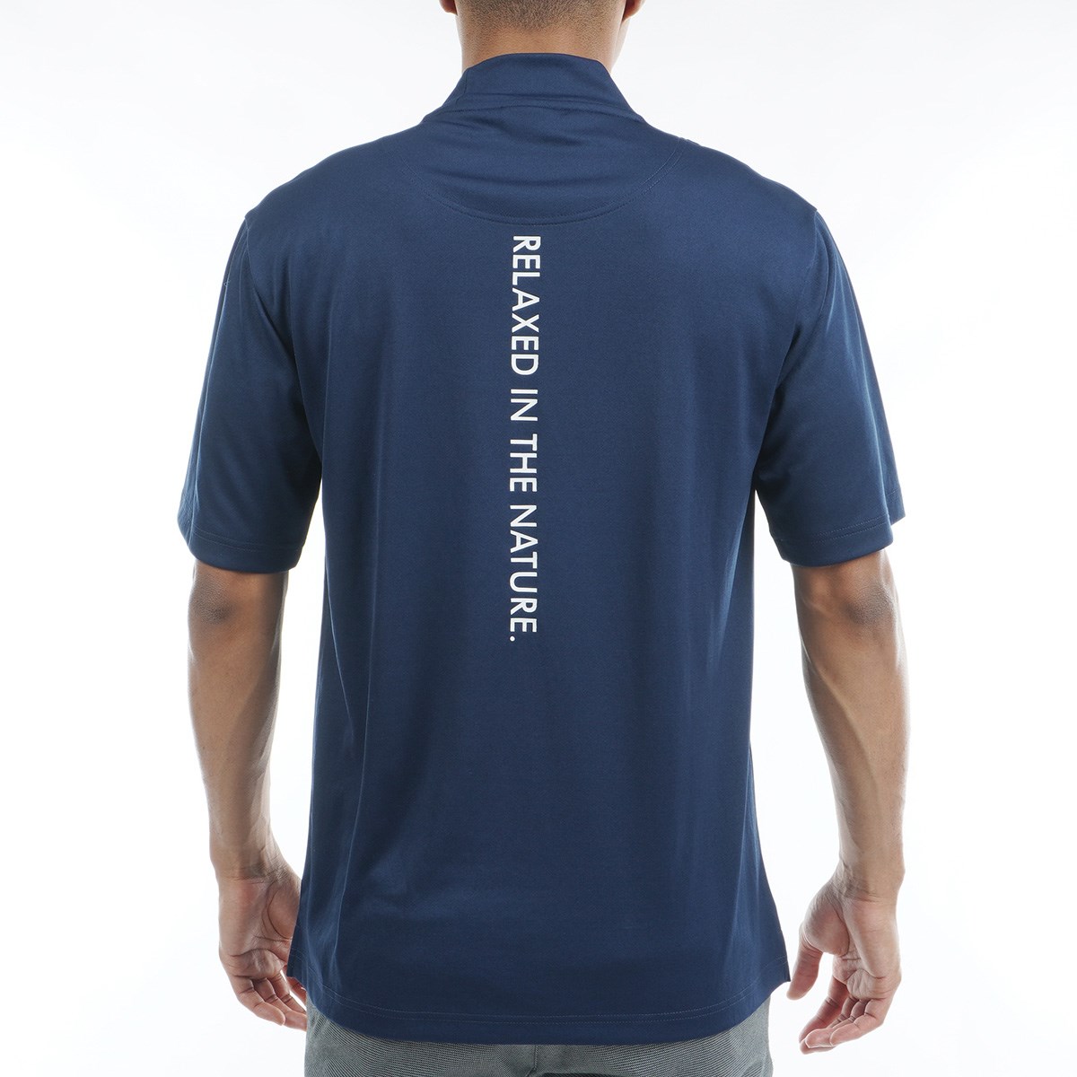 デザインのあるロゴを入れたモックネック半袖シャツ。