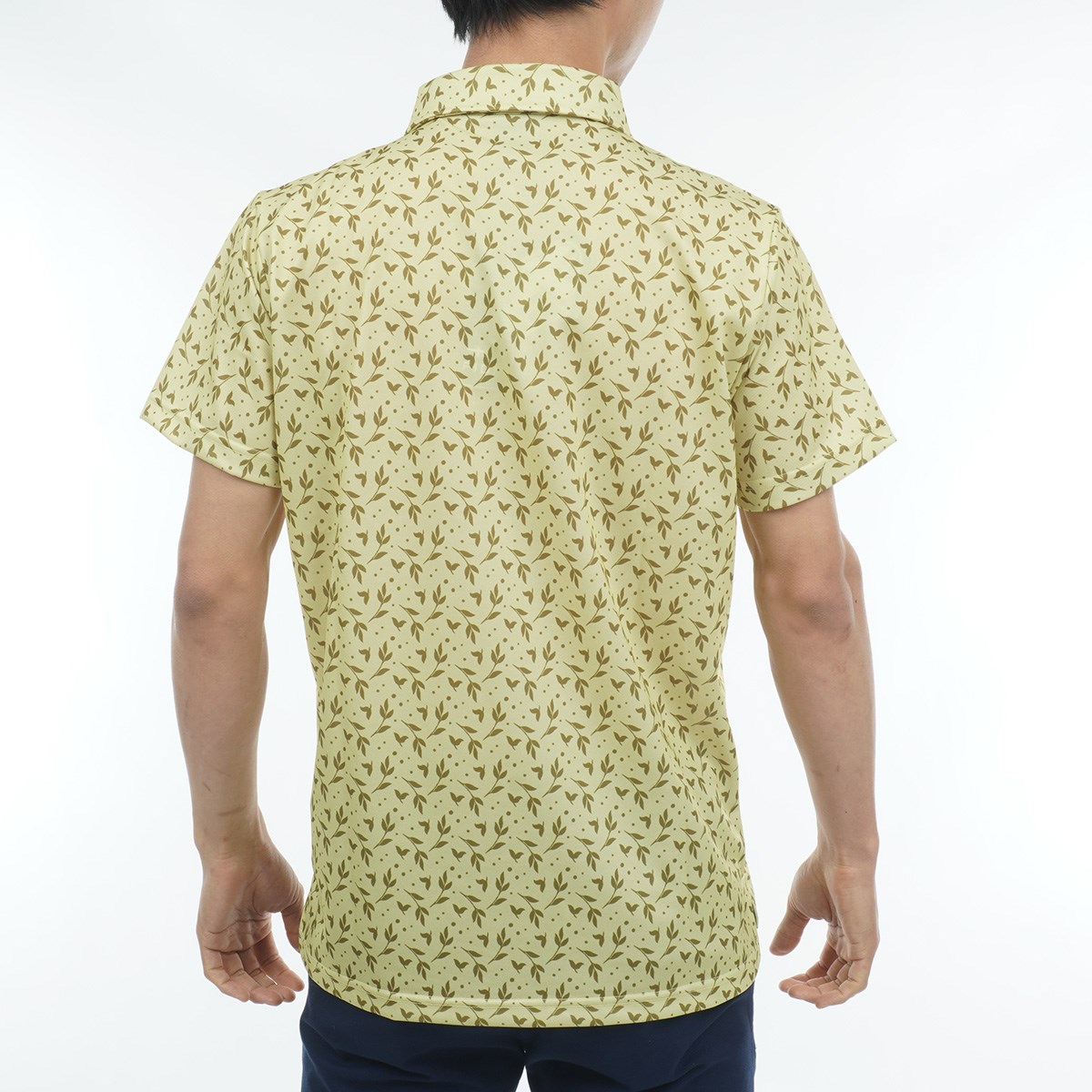 リーフ柄の総柄半袖ポロシャツ。