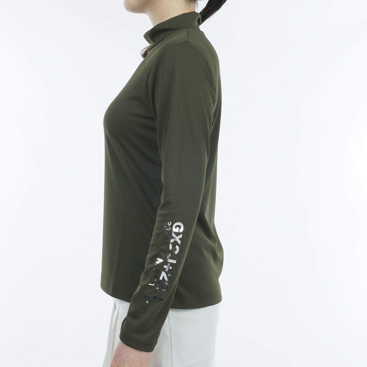 ベーシックな長袖モックネックですが、センターロゴ、左袖の座標がシルバー箔プリントでアクセントに。