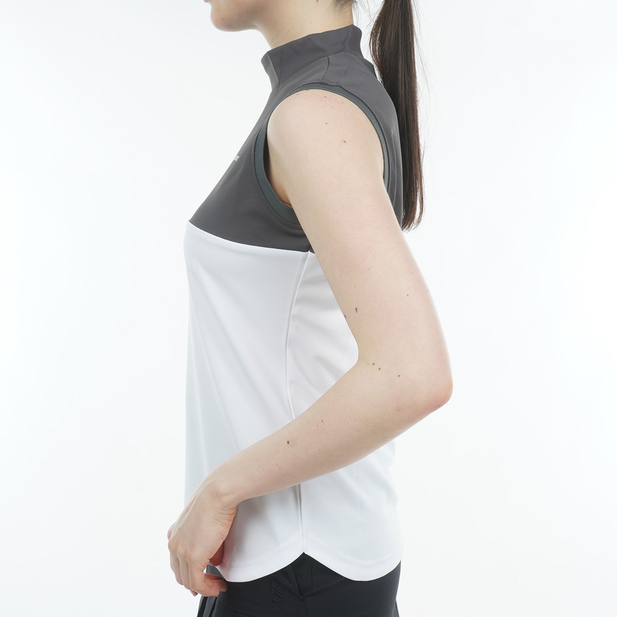 バイカラーで仕上げたカラーブロッキングが印象的なノースリーブハイネックシャツ。