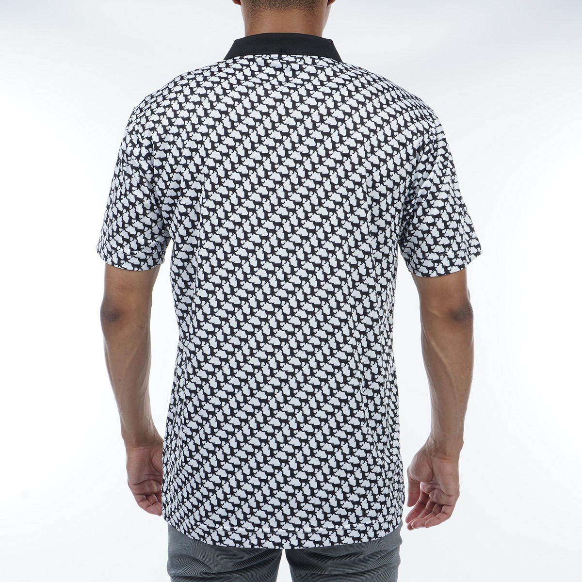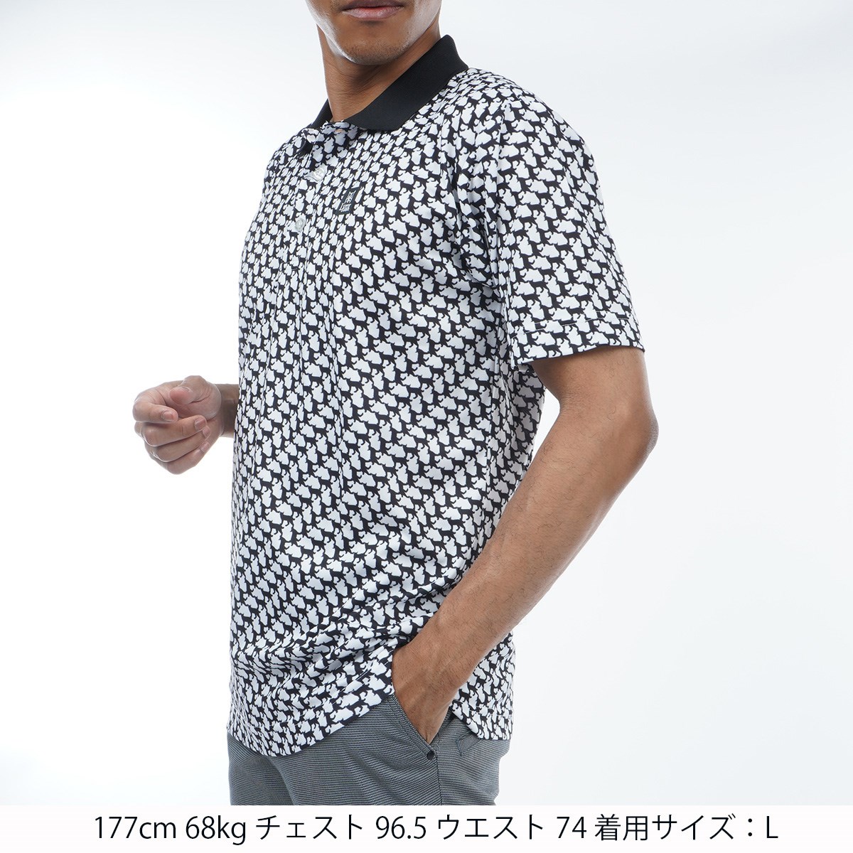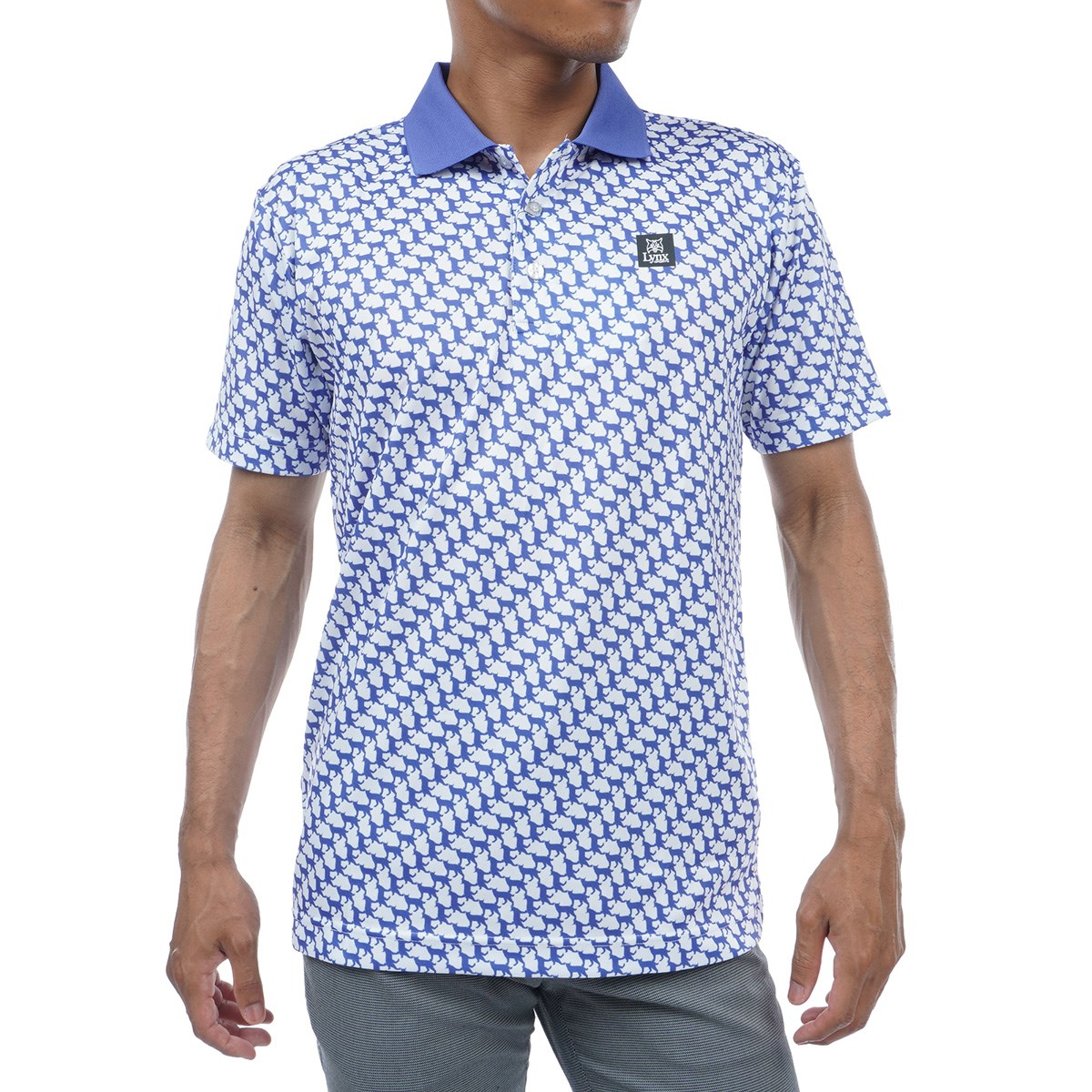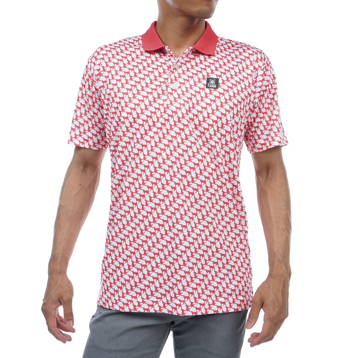 トレードマークであるリンクス(オオヤマネコ)のシャドーシルエットをレイアウトした、連続柄プリントがユニークな半袖ポロシャツです。