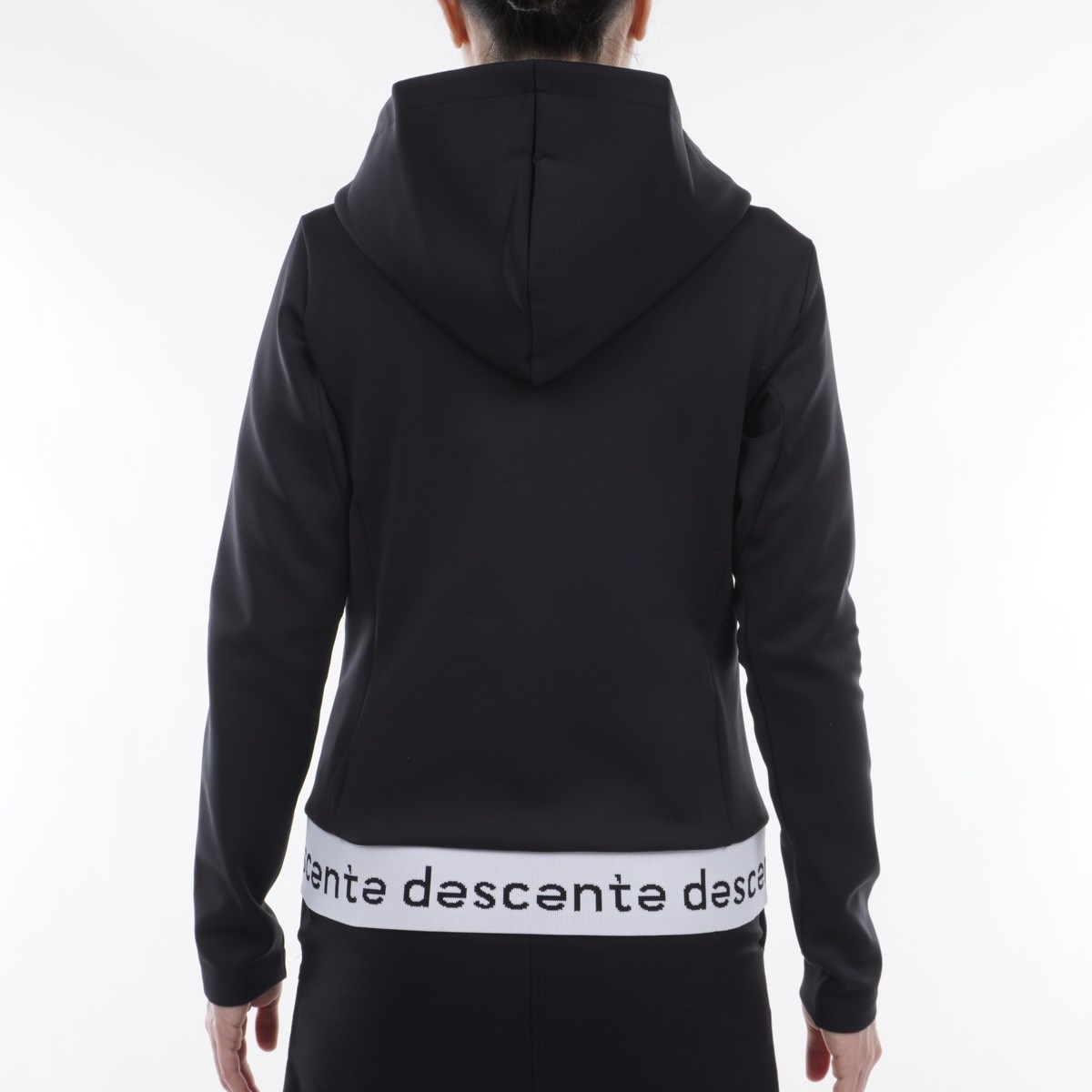 「descente」ロゴマーク入りの裾編みリブがキャッチーな仕上がり。